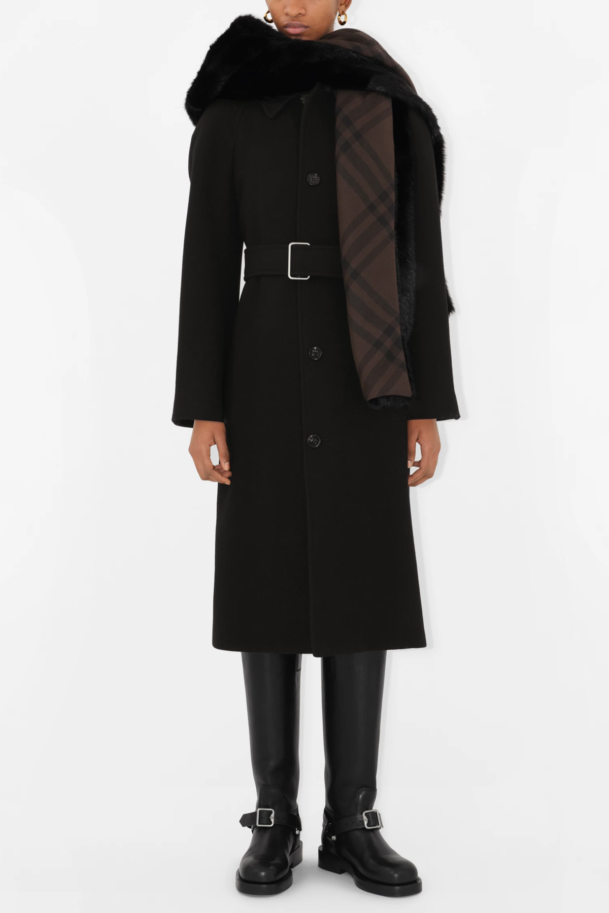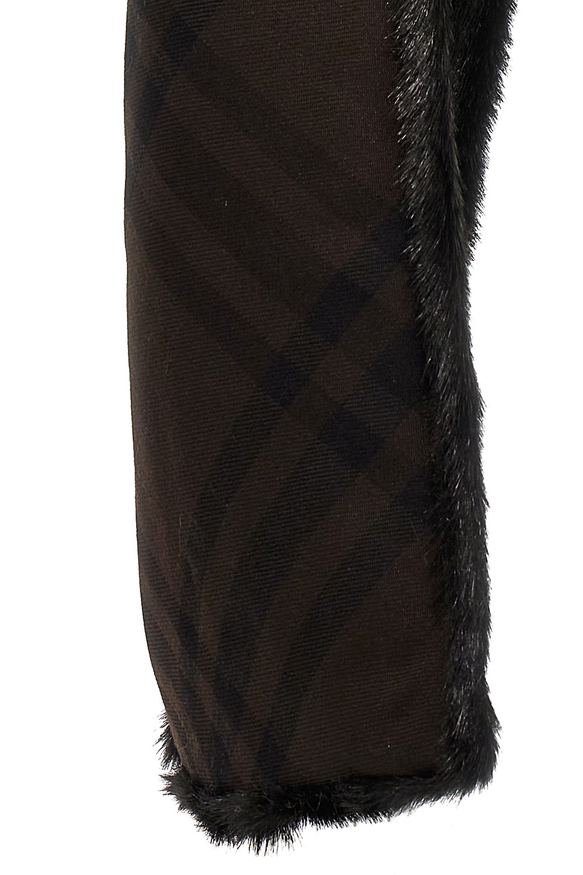 Faux fur hooded scarf with internal check print.