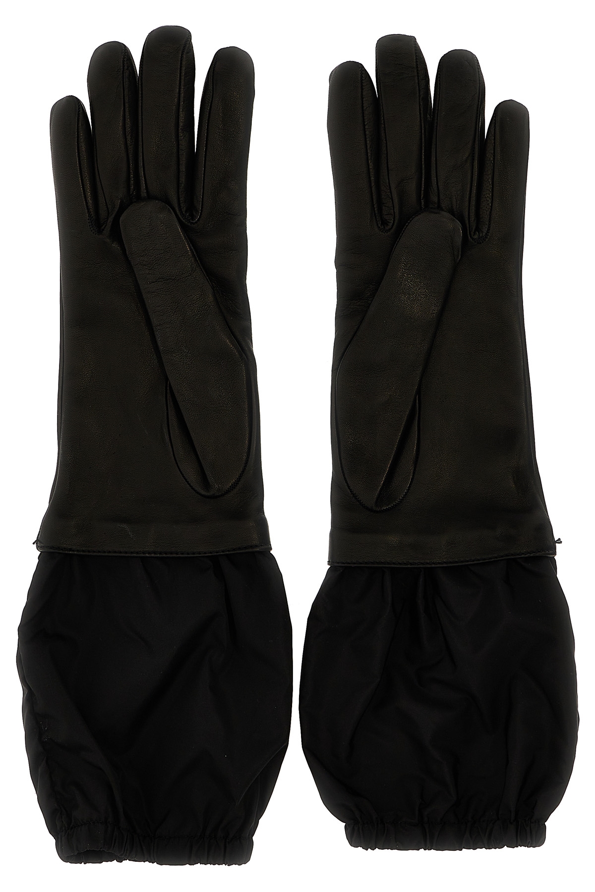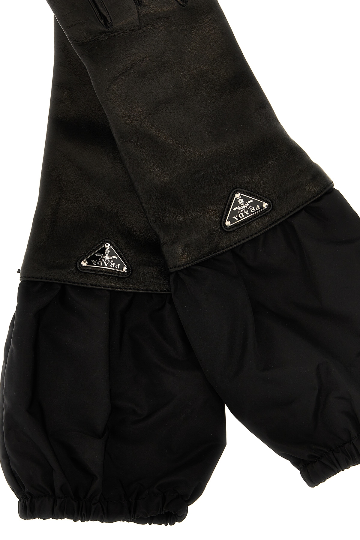 Leather gloves with nylon insert and triangle enamelled metal logo applique.