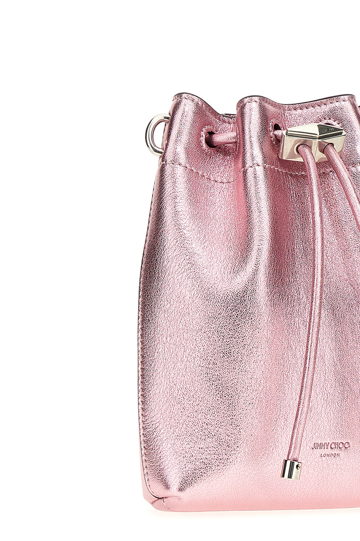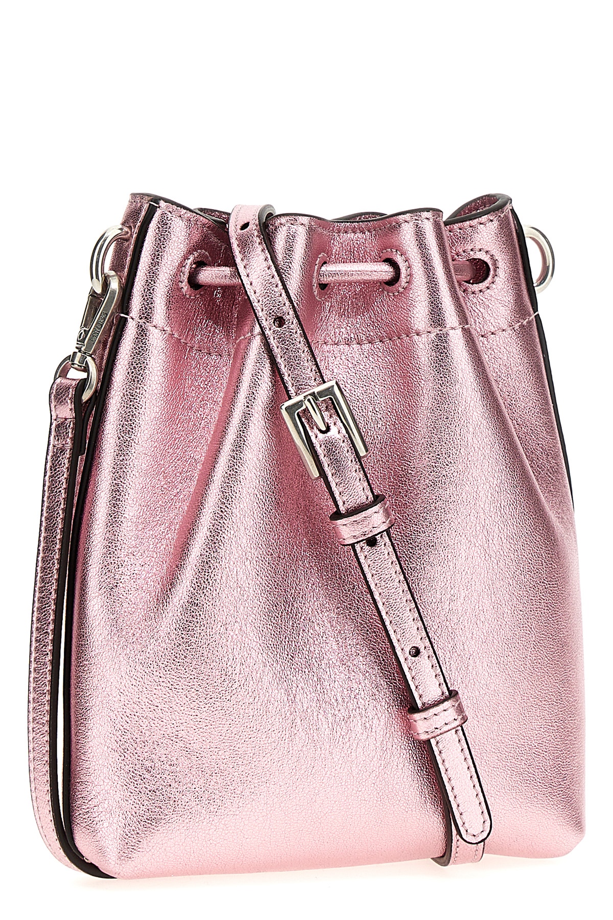 'Bon Bon' bucket bag in shiny metallic leather with drawstring closure, adjustable and removable leather shoulder strap.