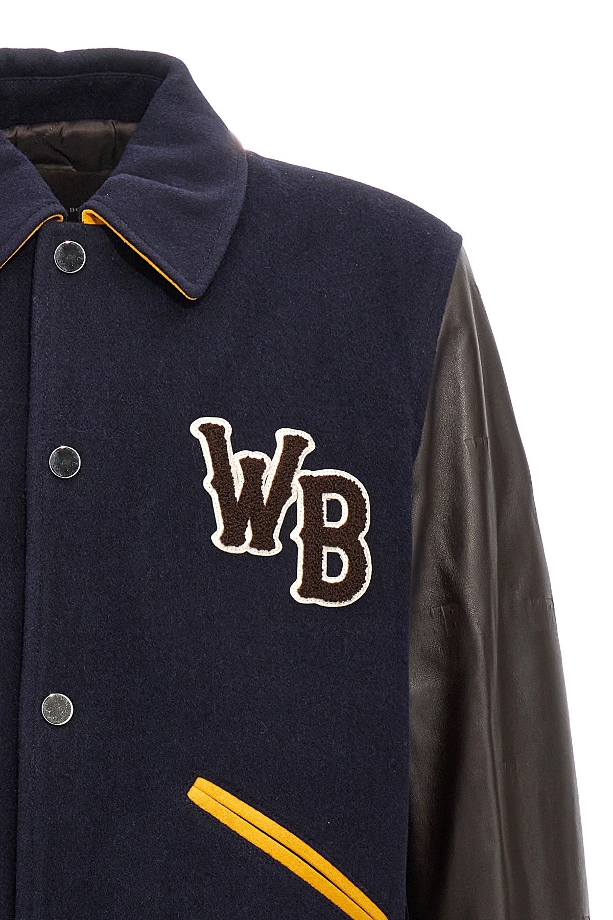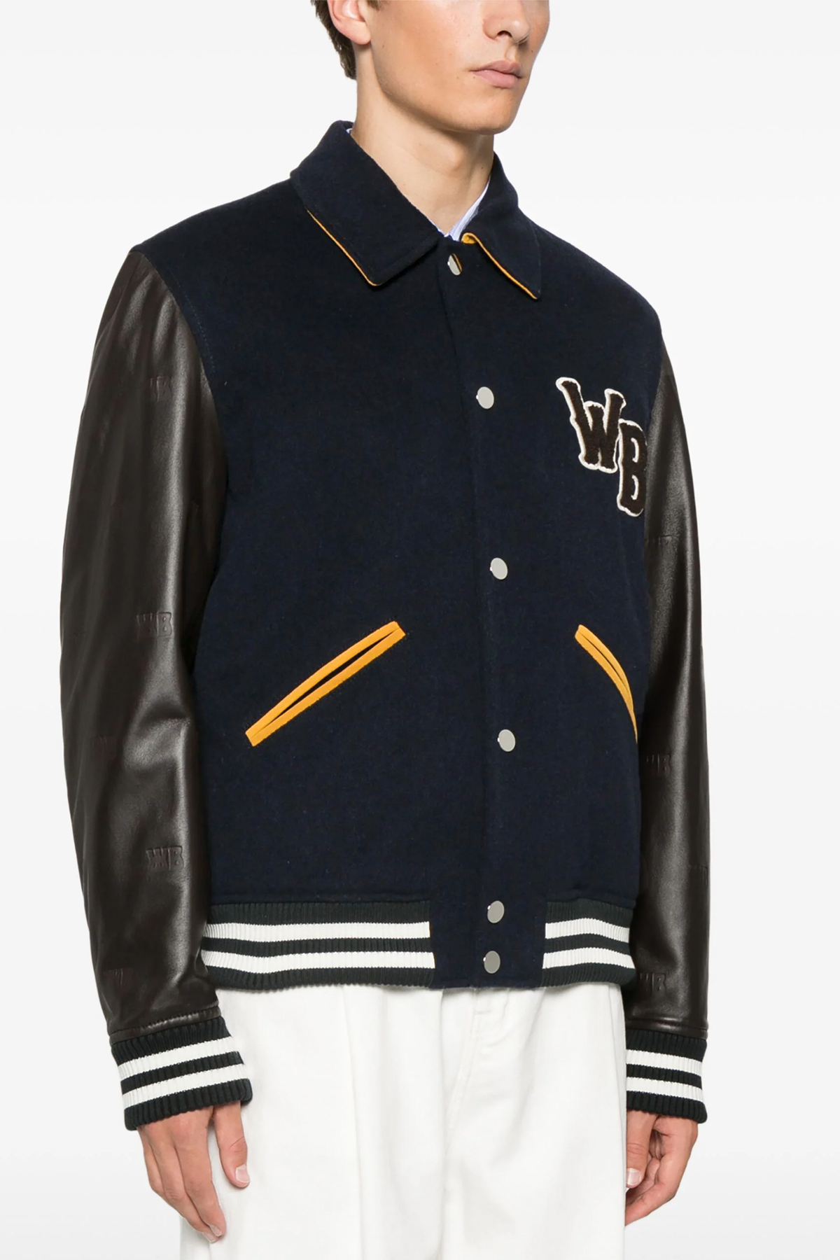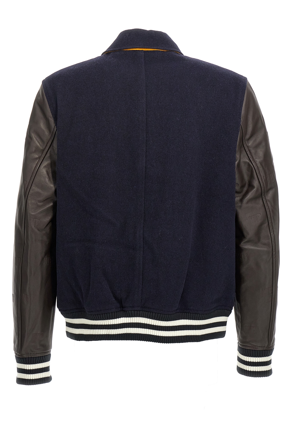 'Prince Varsity' wool blend bomber jacket, front logo patch, long leather sleeves with knitted cuffs, pockets, button closure.