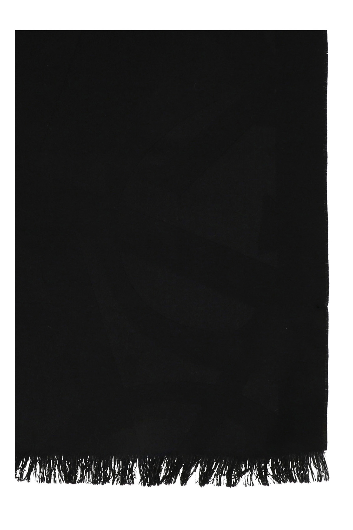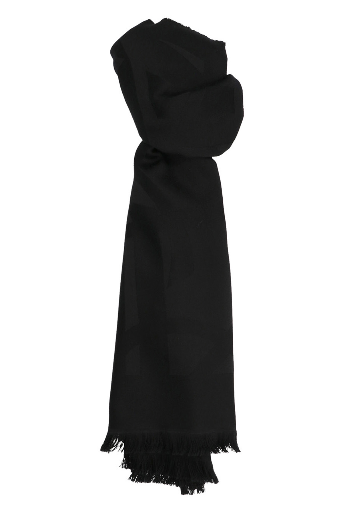 'Monogram' wool scarf with all-over logo, fringed edges.