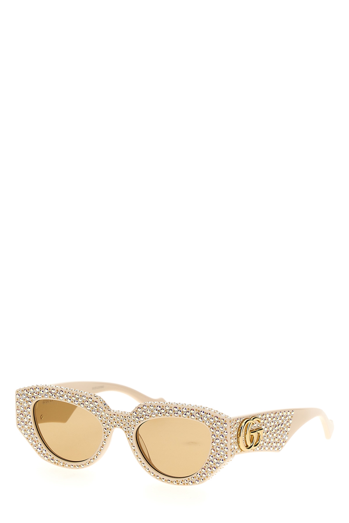 Geometric sunglasses with shiny acetate mount and crystals, shiny acetate rods with Double G. Total BRUEN/UVB protection.