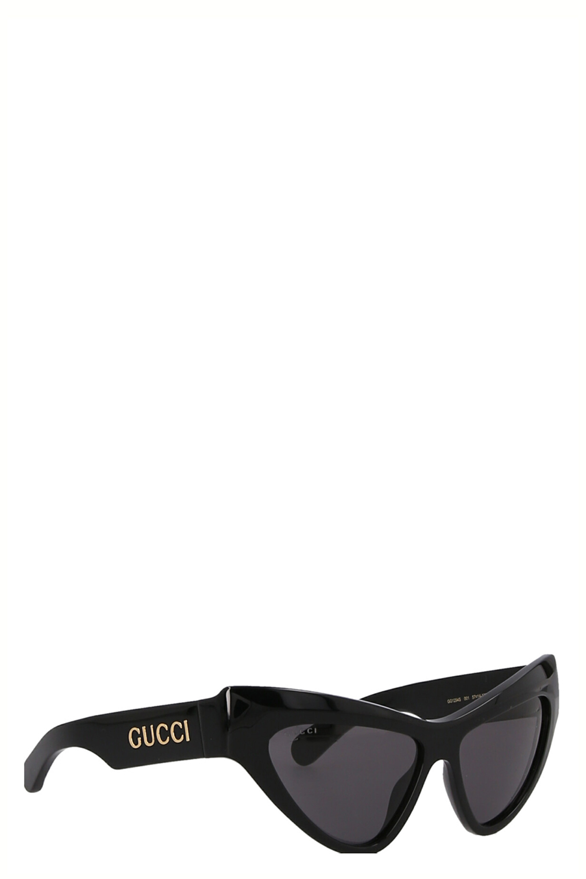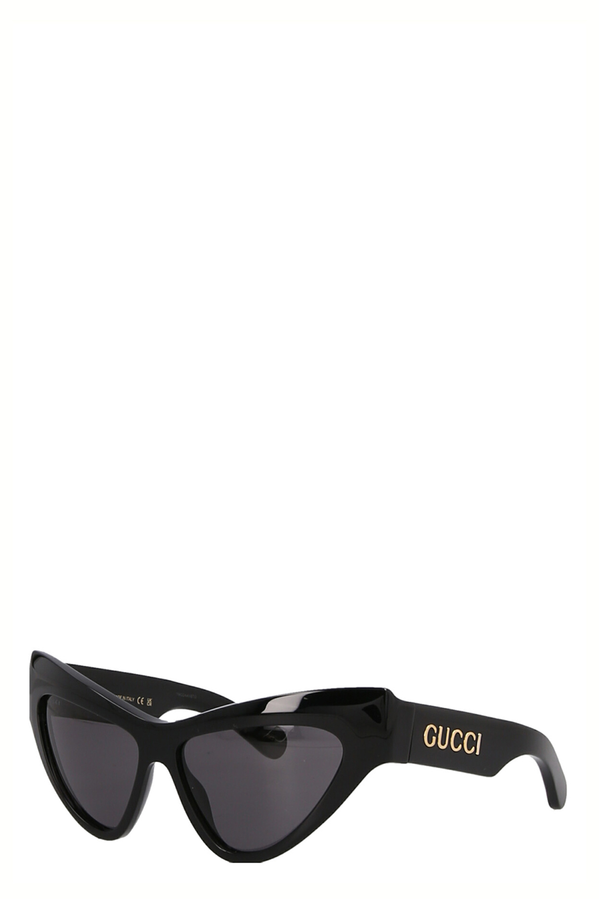 Cat eye sunglasses with a shiny black acetate frame, shiny black acetate temples with Gucci logo detailing and gray solid color lenses. TOTAL UVA/UVB protection