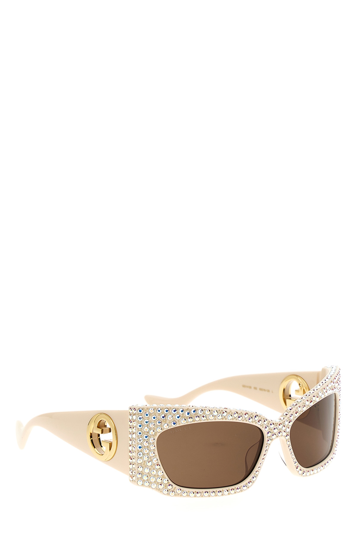 Geometric sunglasses with shiny acetate mount and crystals, shiny acetate rods with crossed GG round gold color cut-out detail. Total PROTECTION OF UVB/UVB.