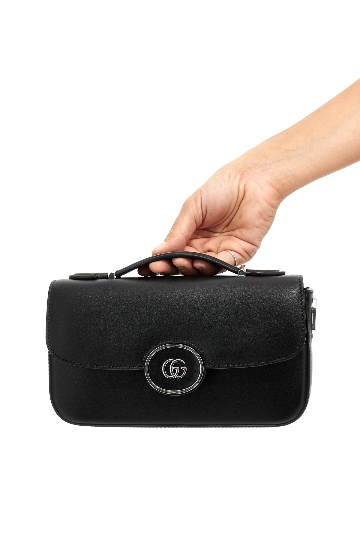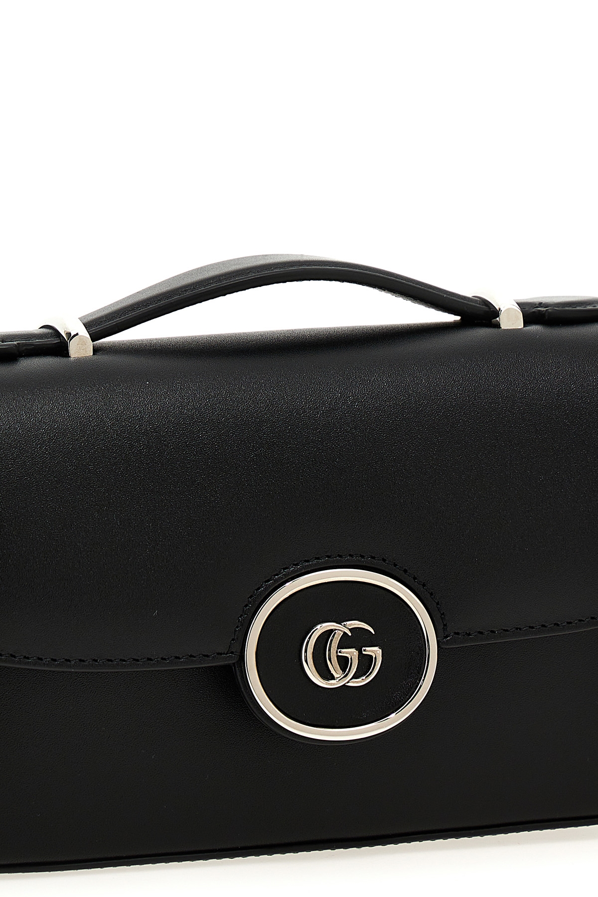'Mini Petite GG' leather handbag with snap padlock closure, front logo applique, top handle, adjustable and removable shoulder strap.