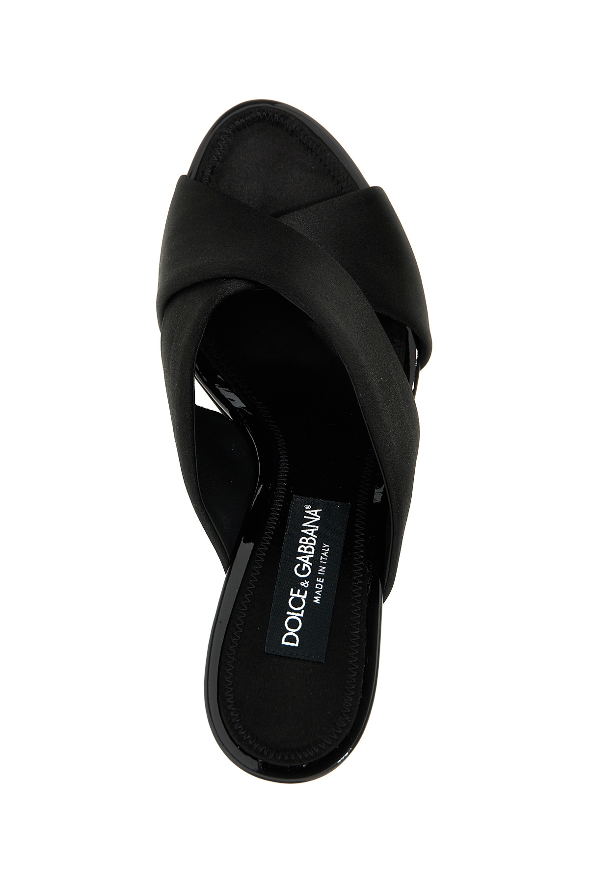 Satin sandal with shiny leather details, crossed bands on the front, metal heel with logo detail.
