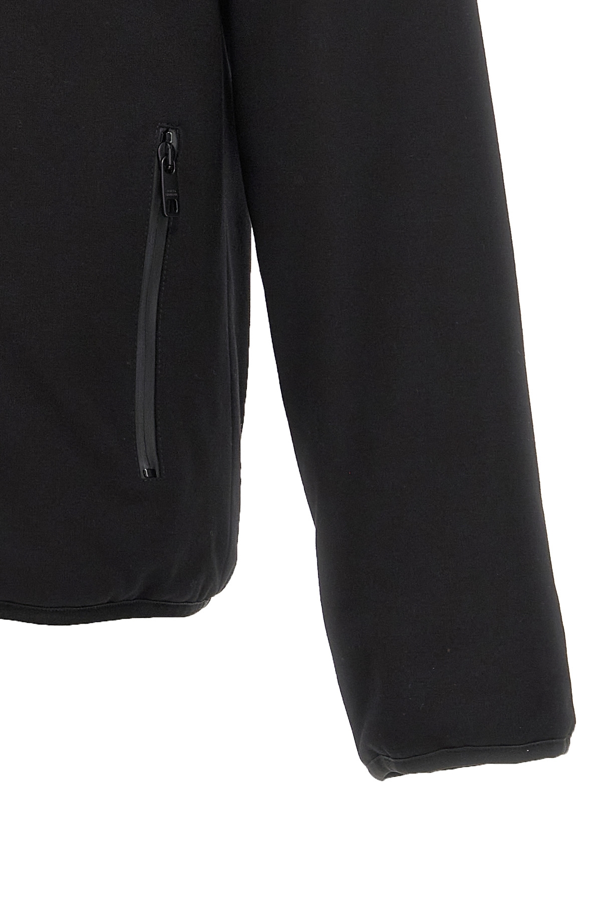 Lightly padded stretch technical jersey jacket, front metal logo plate, drawstring hood, zip closure, long sleeves.