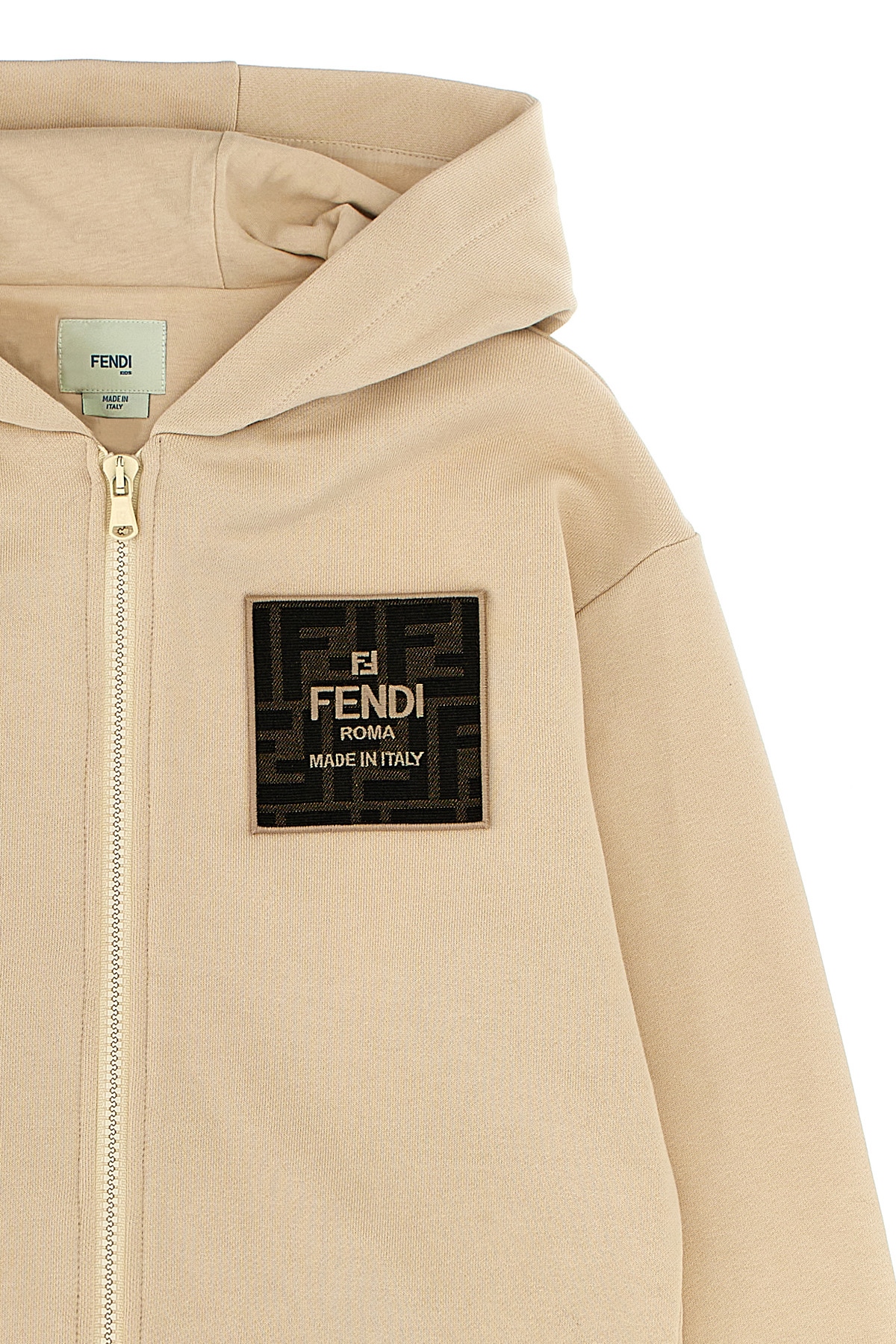 Cotton hoodie with front logo patch, zip closure, pockets, long cuffed sleeves.