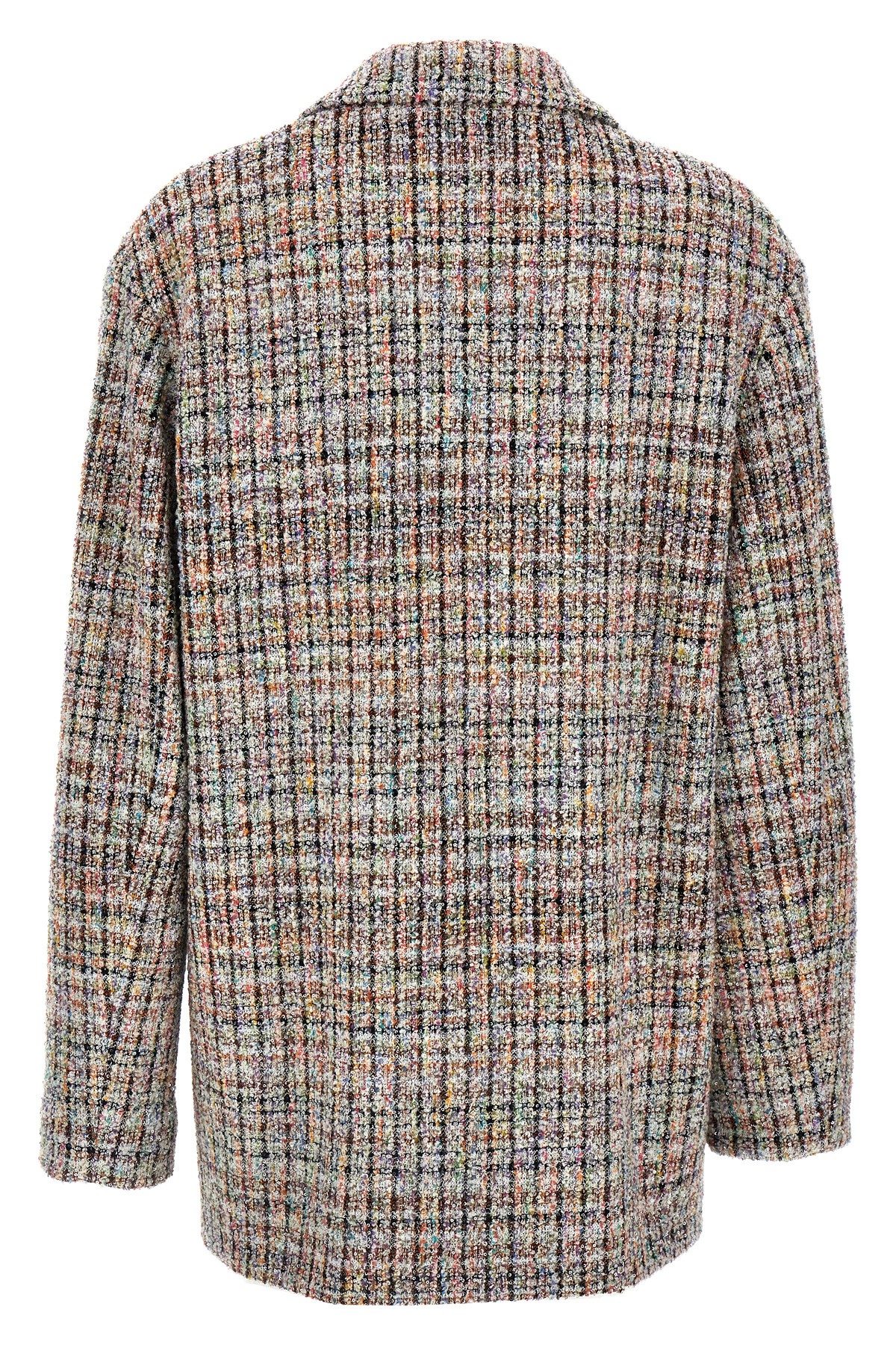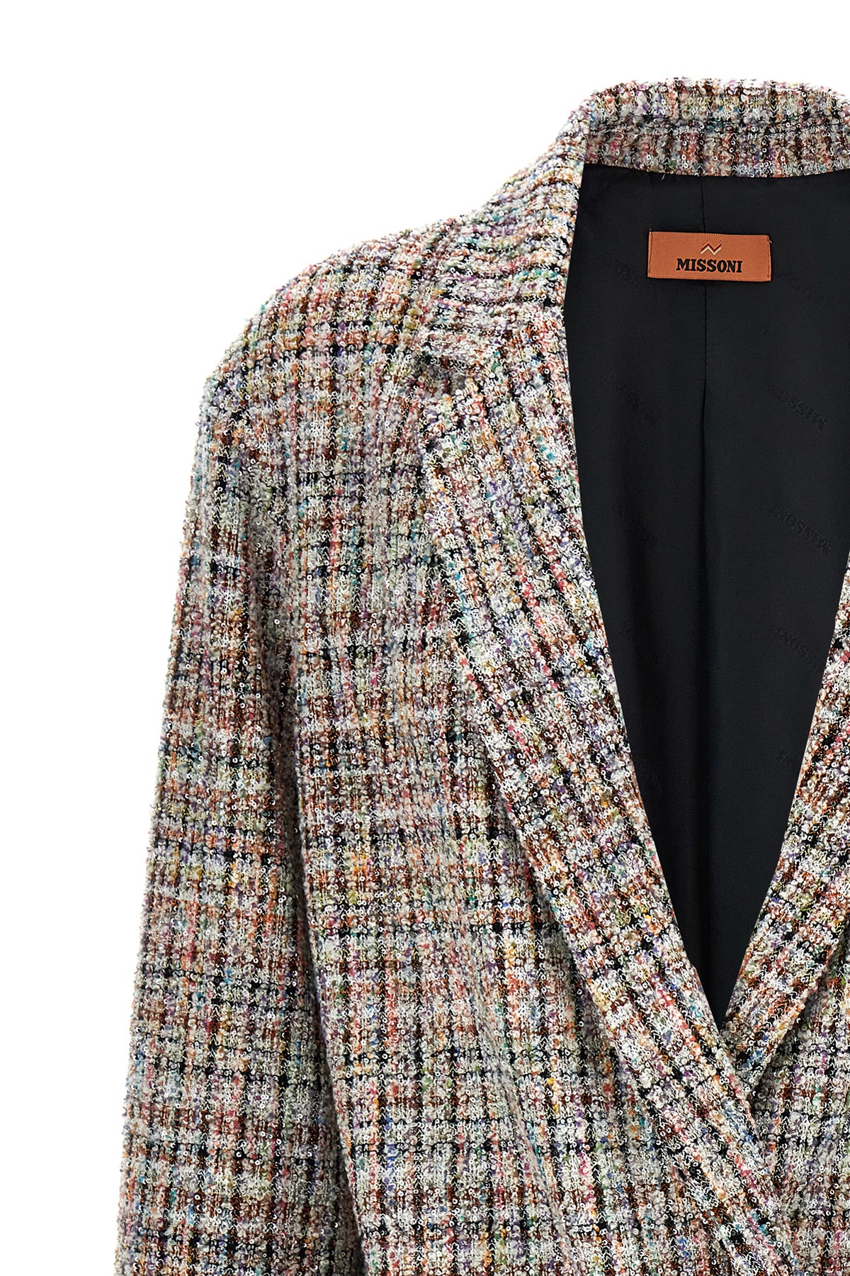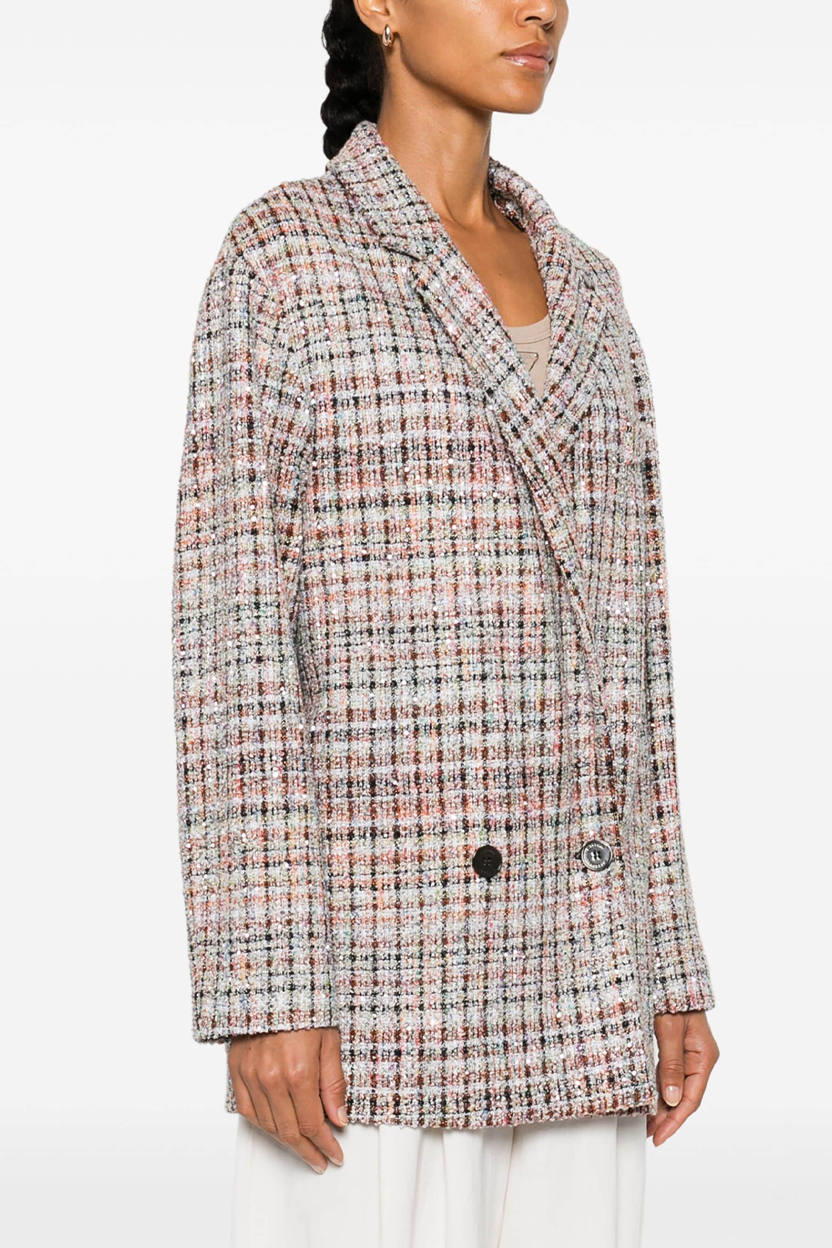 Double-breasted blazer in checked boucle fabric with sequin applique, peak lapels, button closure, pockets, long sleeves.
