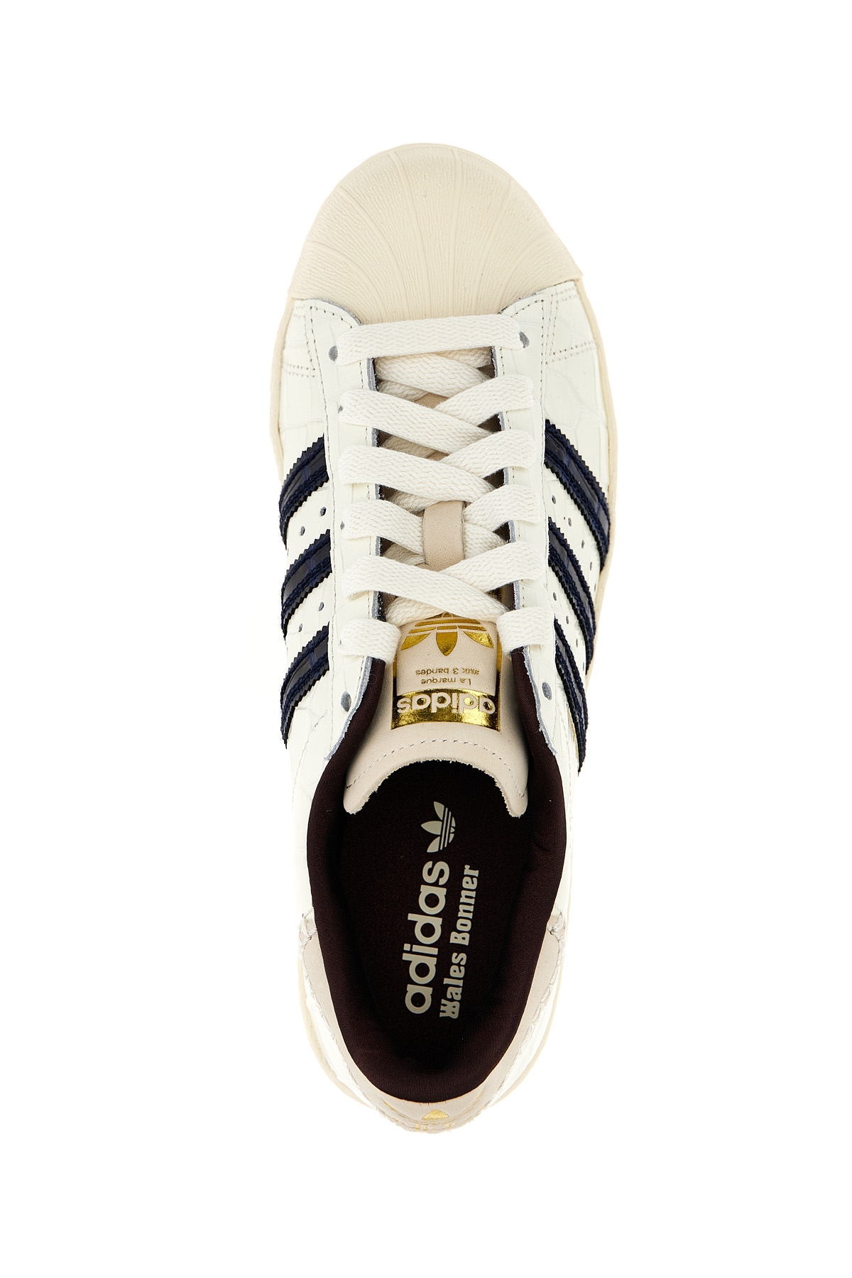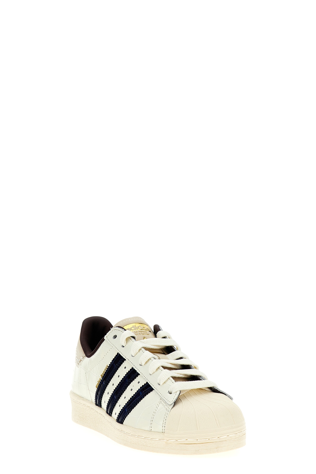 Adidas Originals by Wales Boner 'WB Superstar' sneakers in crocodile-effect leather with laces and rubber sole.
