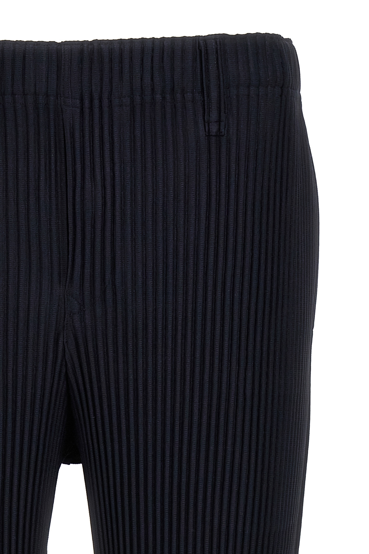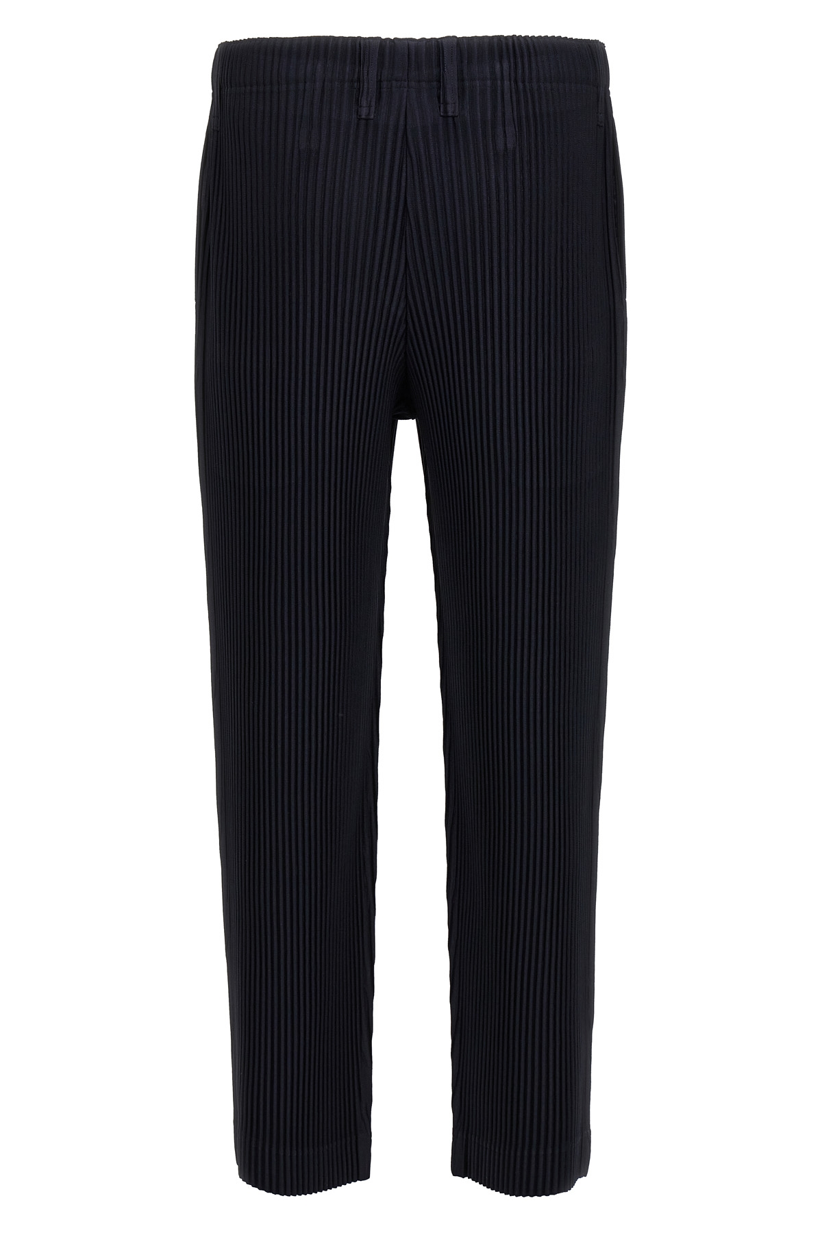 Pleated fabric trousers, elastic waistband and belt loops, button flap, pockets.