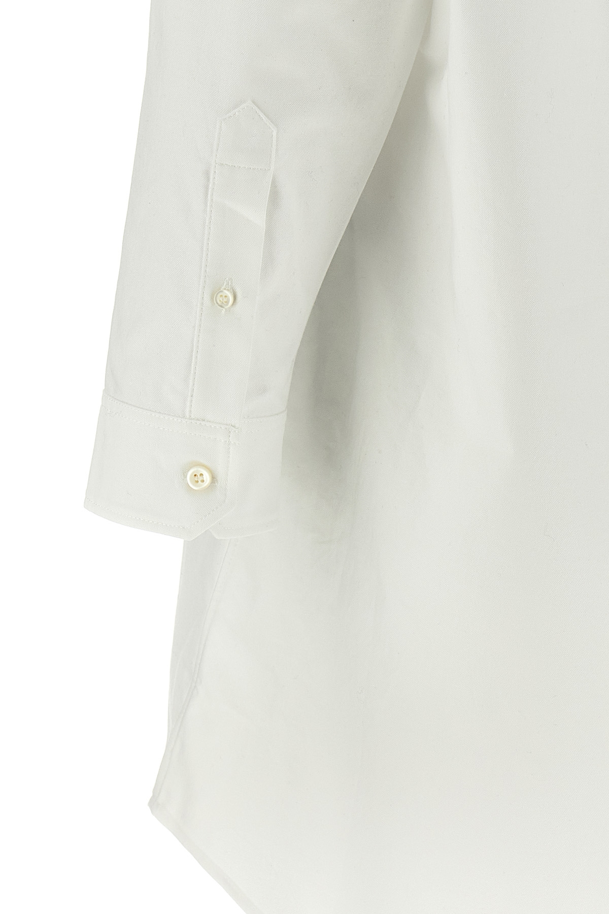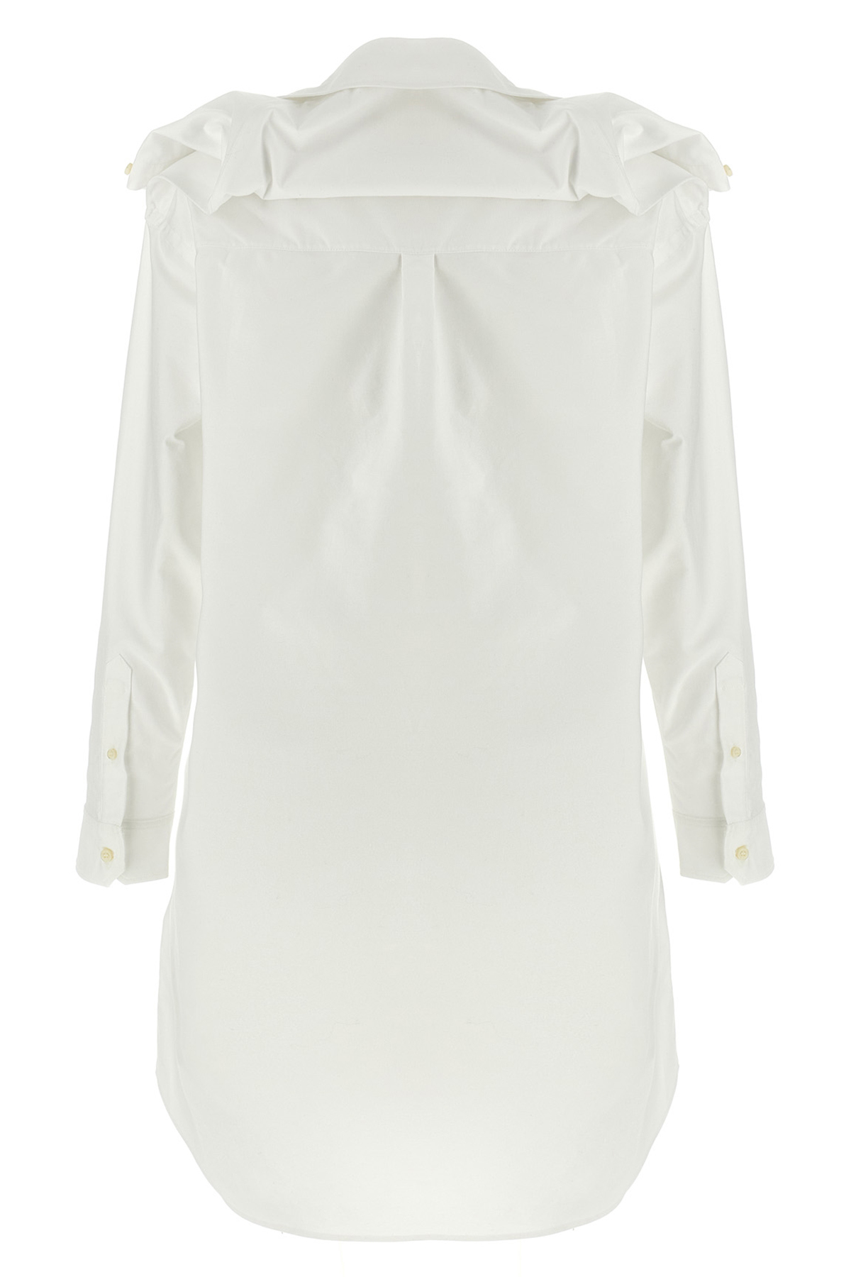 Chemisier dress in cotton oxford with asymmetric and curled collar with removable chain detail, button closure, long cuffed sleeves.