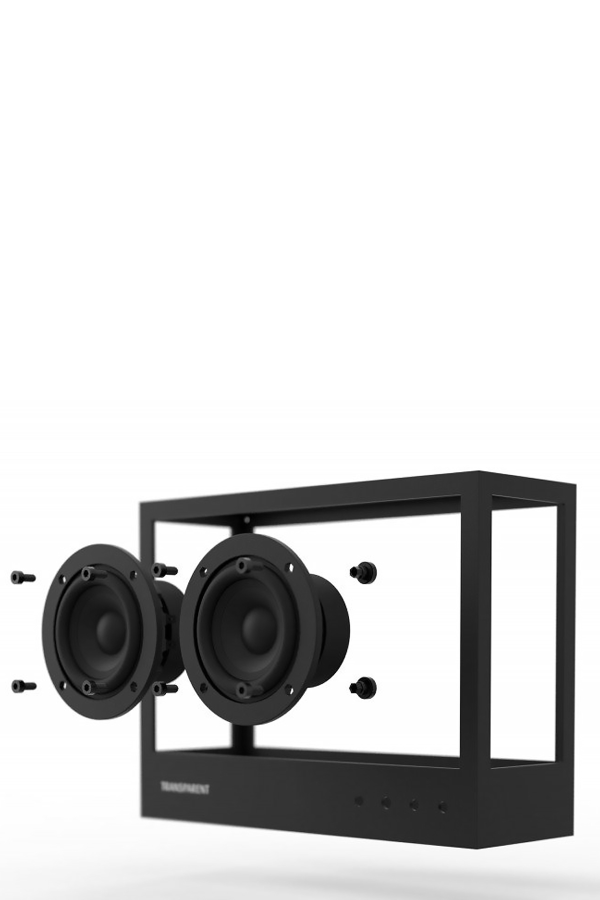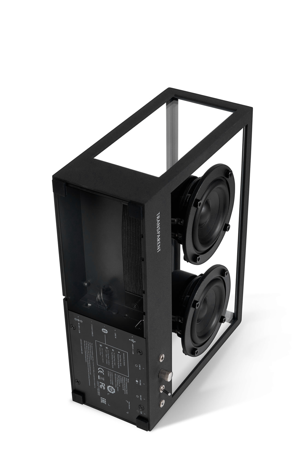 'Small Transparent Speaker' high-quality speaker with cable or 5.0 Bluetooth feature. Can be used alone or in combination. Two speakers (L/R) can be paired via 5.0 Bluetooth or a cable. Also compatible with other speakers. Made in aluminum and glass. Wireless: Bluetooth and streaming with double "True Wireless" speaker Compatible with Apple AirPlay, Sonos, Amazon Echo and Google Cast Upgradeable: Can host a third party voice control, multiroom or Wi-Fi module. Cables: Long and short audio cable, long and short power cable (USB) Wireless: Bluetooth and Dual Speaker Streaming Lower compartment with USB charger Wall mounting: brackets and hardware included Manual L/R drivers: 2 × 3'' (full range) Amplifier: D-Class integrated (Active) Rated power: 2x 15 W Sealed cabinet volume: 3 l Frequency response: 60 Hz - 20 kHz ±3 dB in axis High-quality Digital Signal Processing (DSP) Front controls: Volume Line in: 2 x 3.5 mm (front and lower)