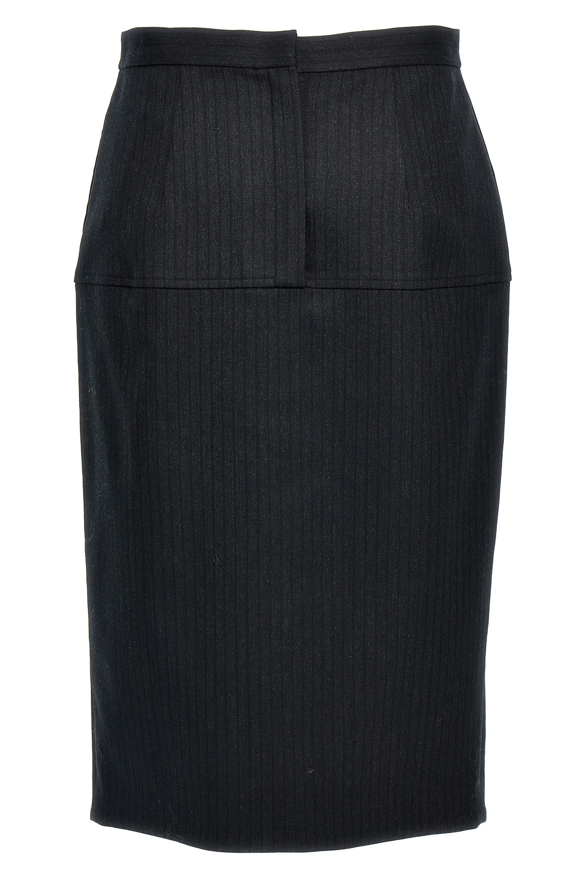 Pinstripe wool skirt, sheath dress, pockets, zip, hook and back button closure, diagonal front split.