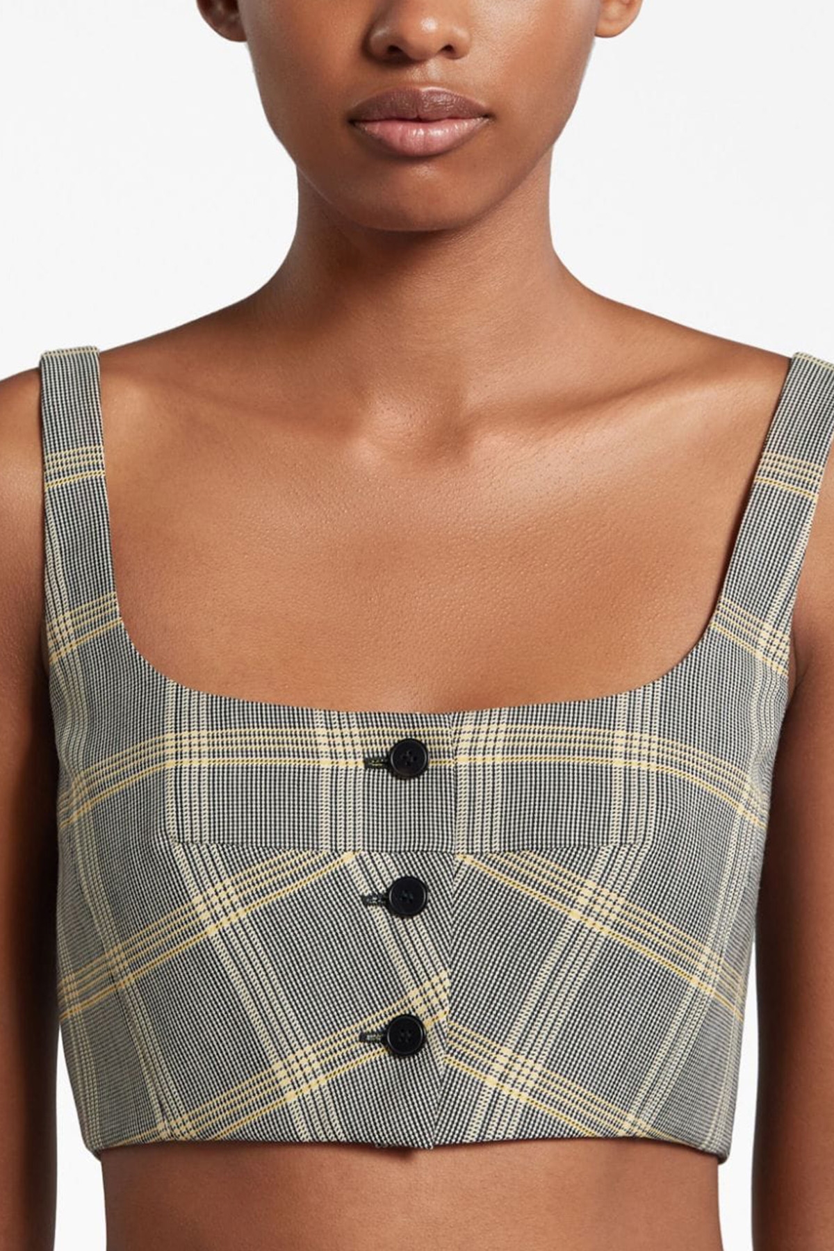 Check print wool blend cropped top, front button closure.