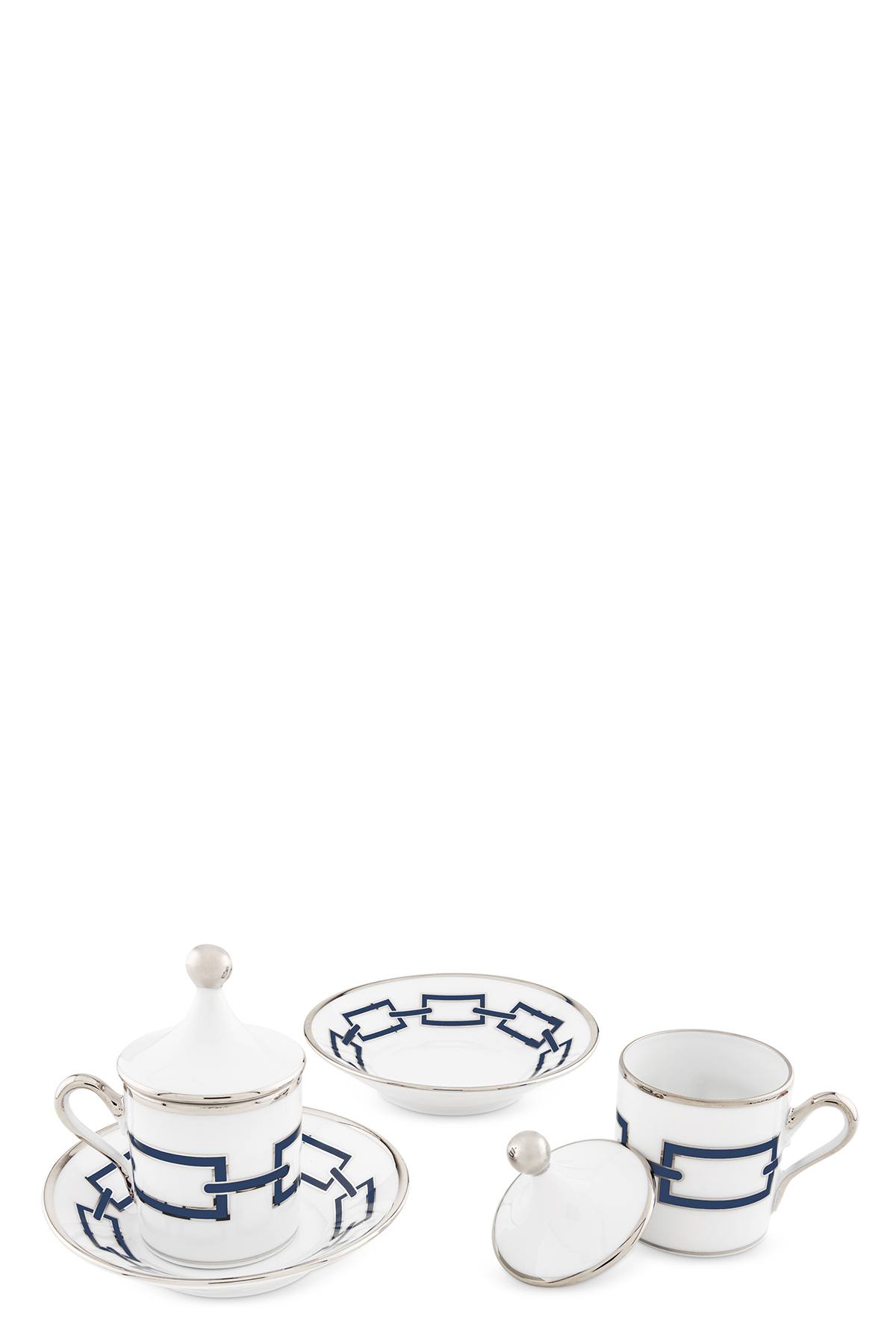 Coffee set of two cups with lid and two porcelain 'Impero Catene' saucers with blue and platinum decoration.