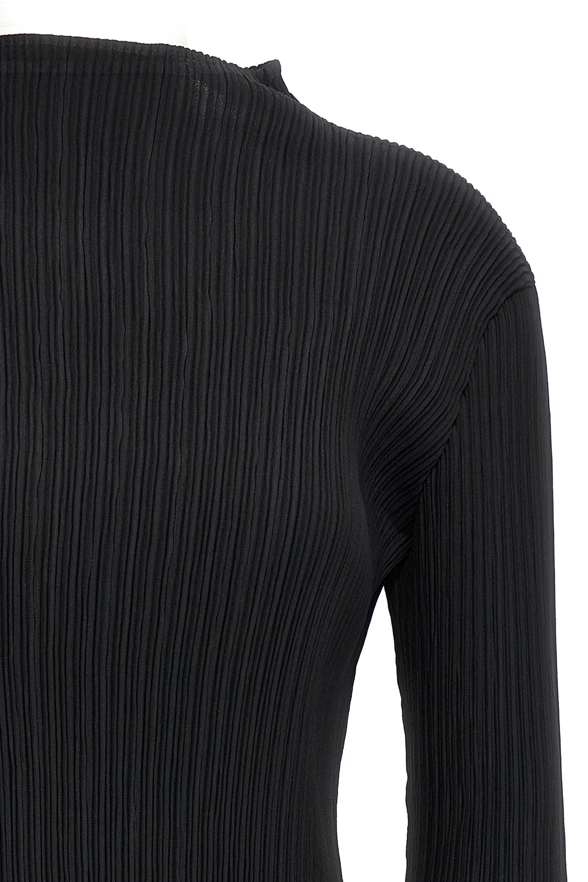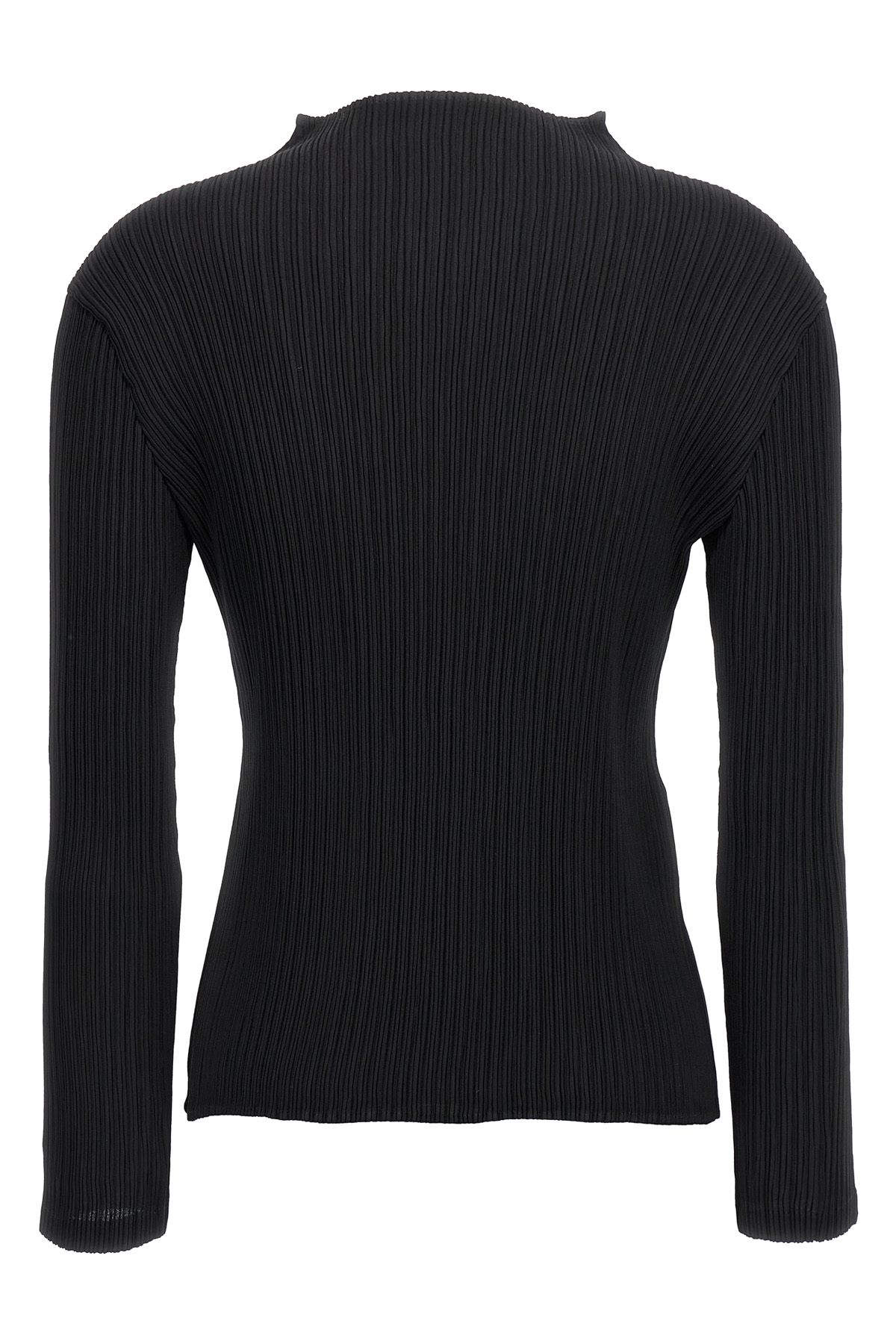 'Hatching Pleats' pleated fabric top with high neck, long sleeves.