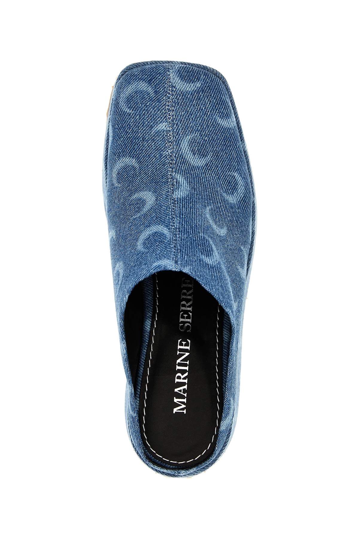 Denim wedge sabots with all-over 'Moon Laser' print, leather insole, rubber sole.