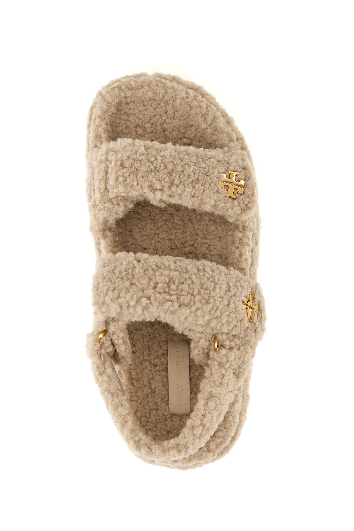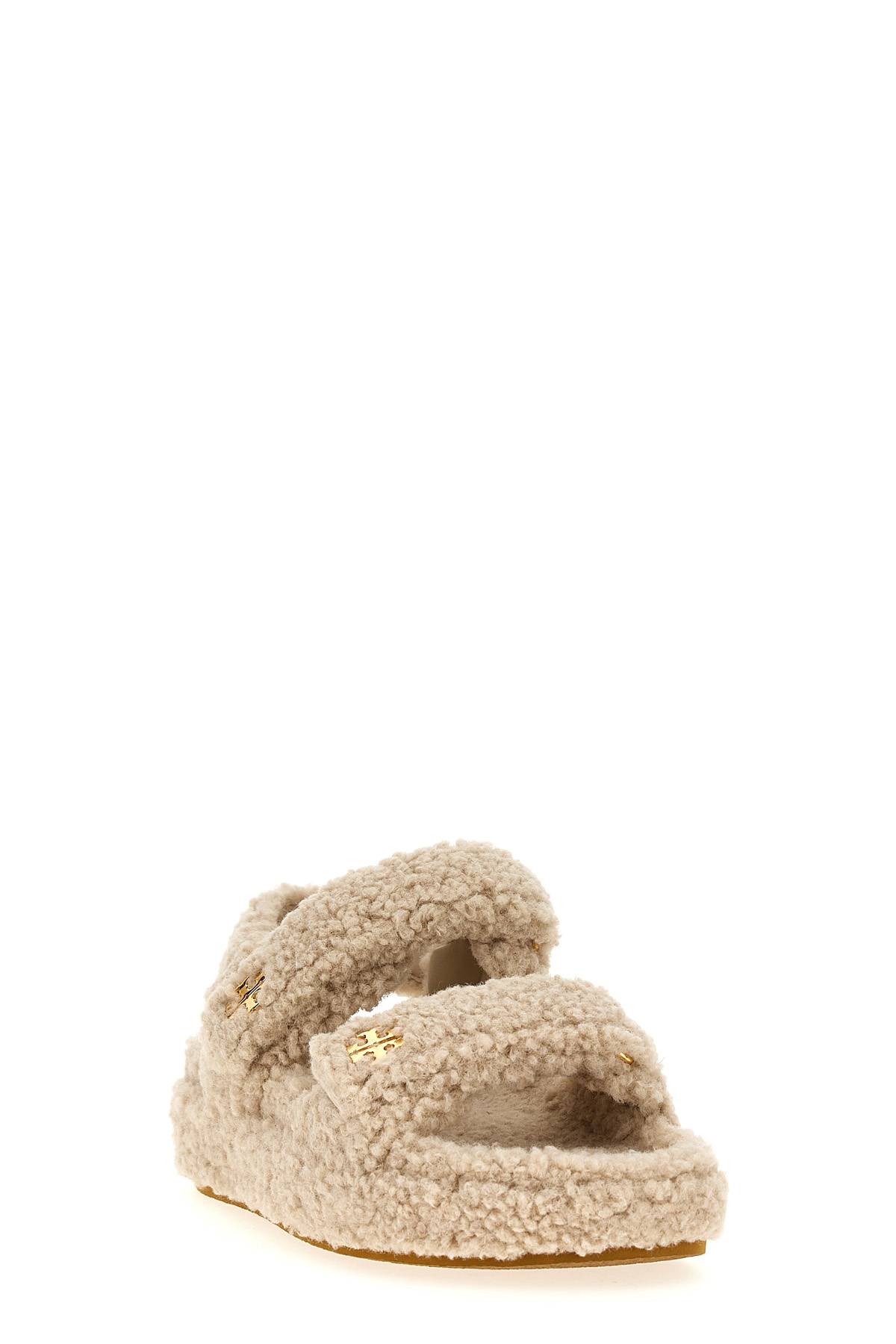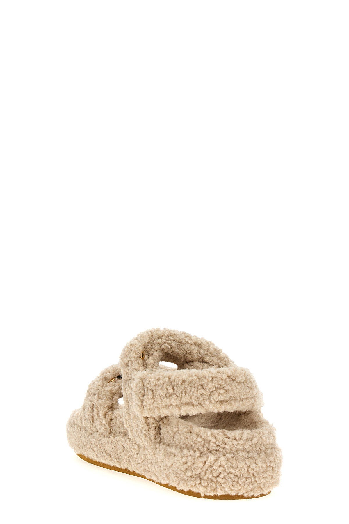 'Kira' sandals in shearling-effect fabric, adjustable Velcro bands with metal logo application, rubber sole.
