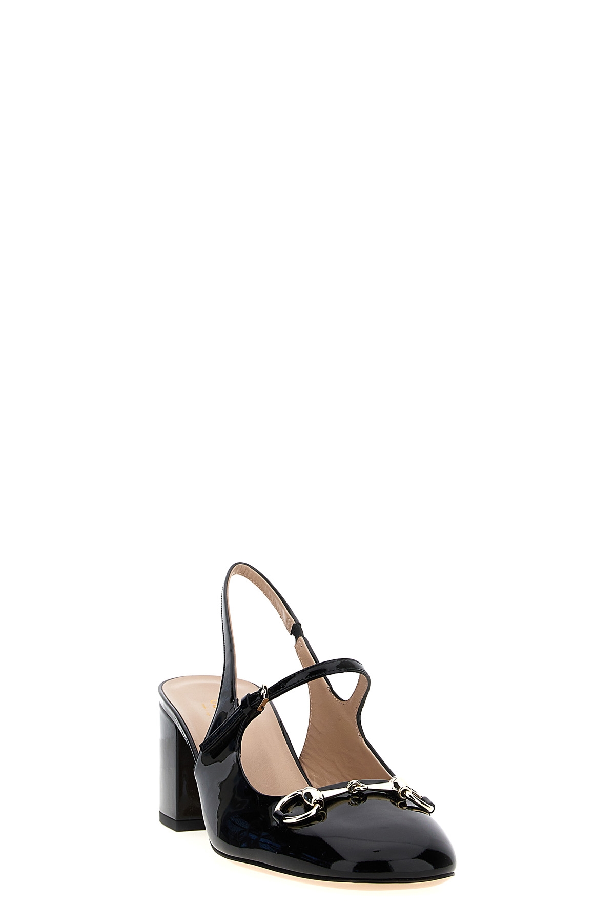 Patent leather pumps, adjustable front strap, elastic back strap, metal 'Morsetto' application, wide heels.