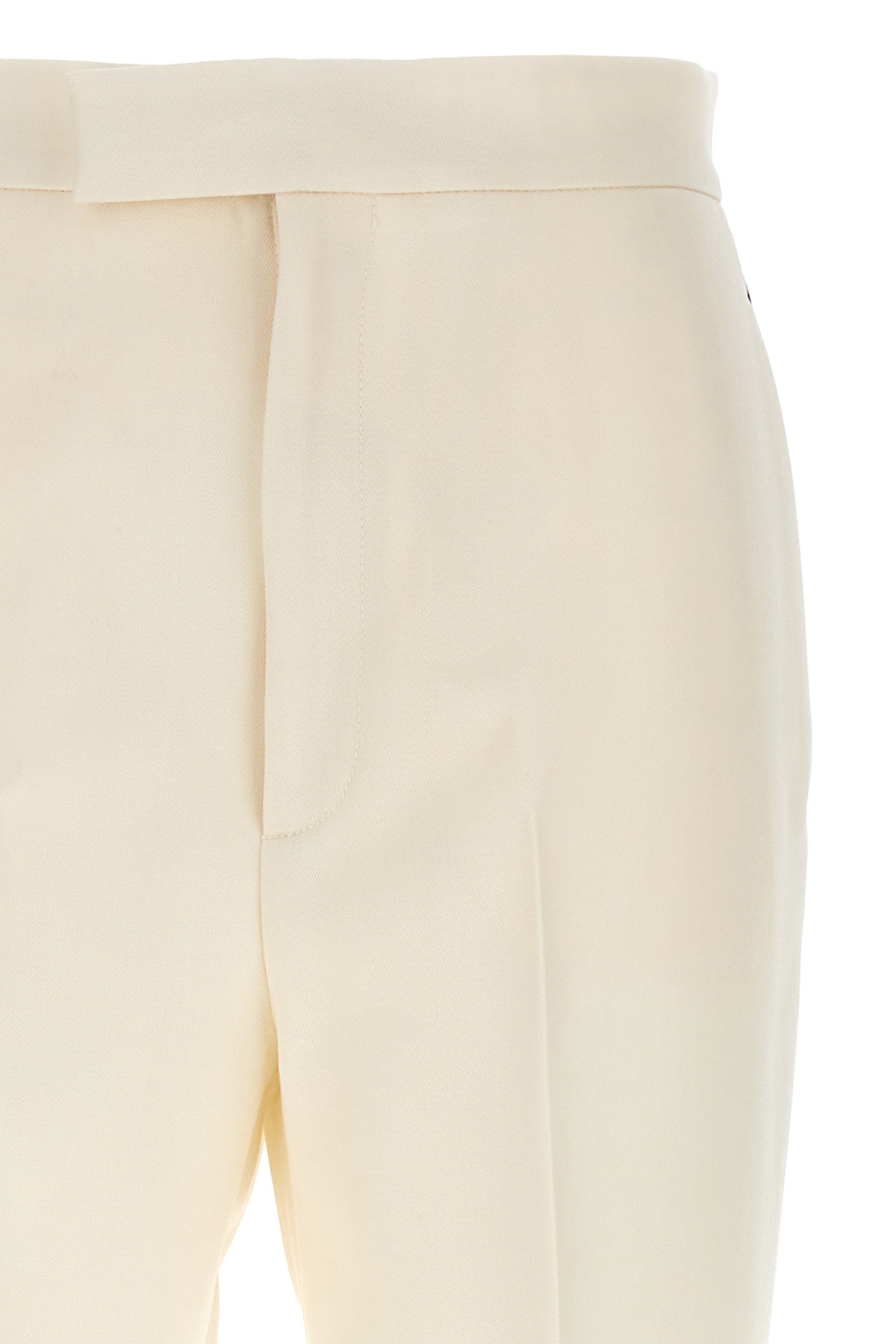 Wool pants with contrasting side bands, zipper, hook and button closure, pockets.