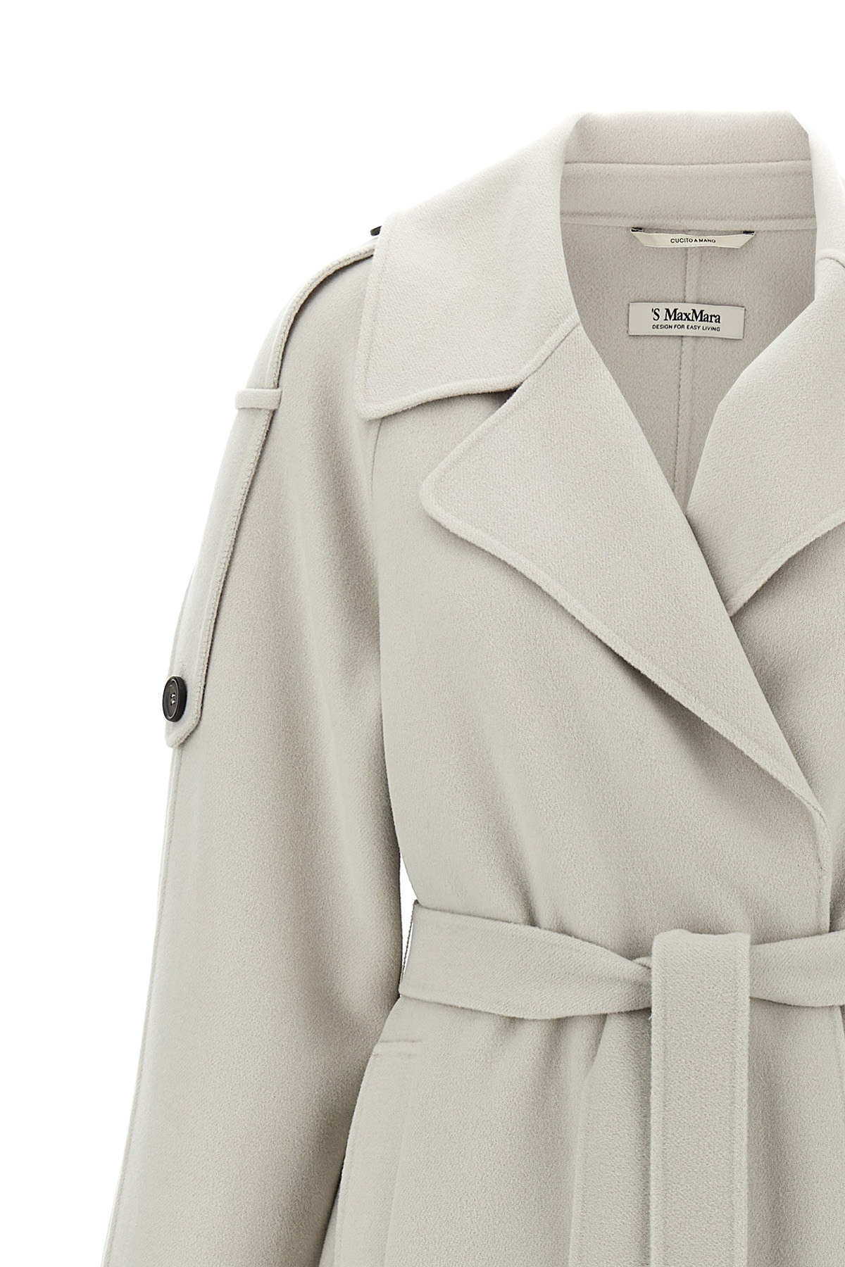 'Beato' coat in double wool drap, long sleeves and wings on shoulders, pockets, cape on the back, back split, matching belt to tie at the waist.