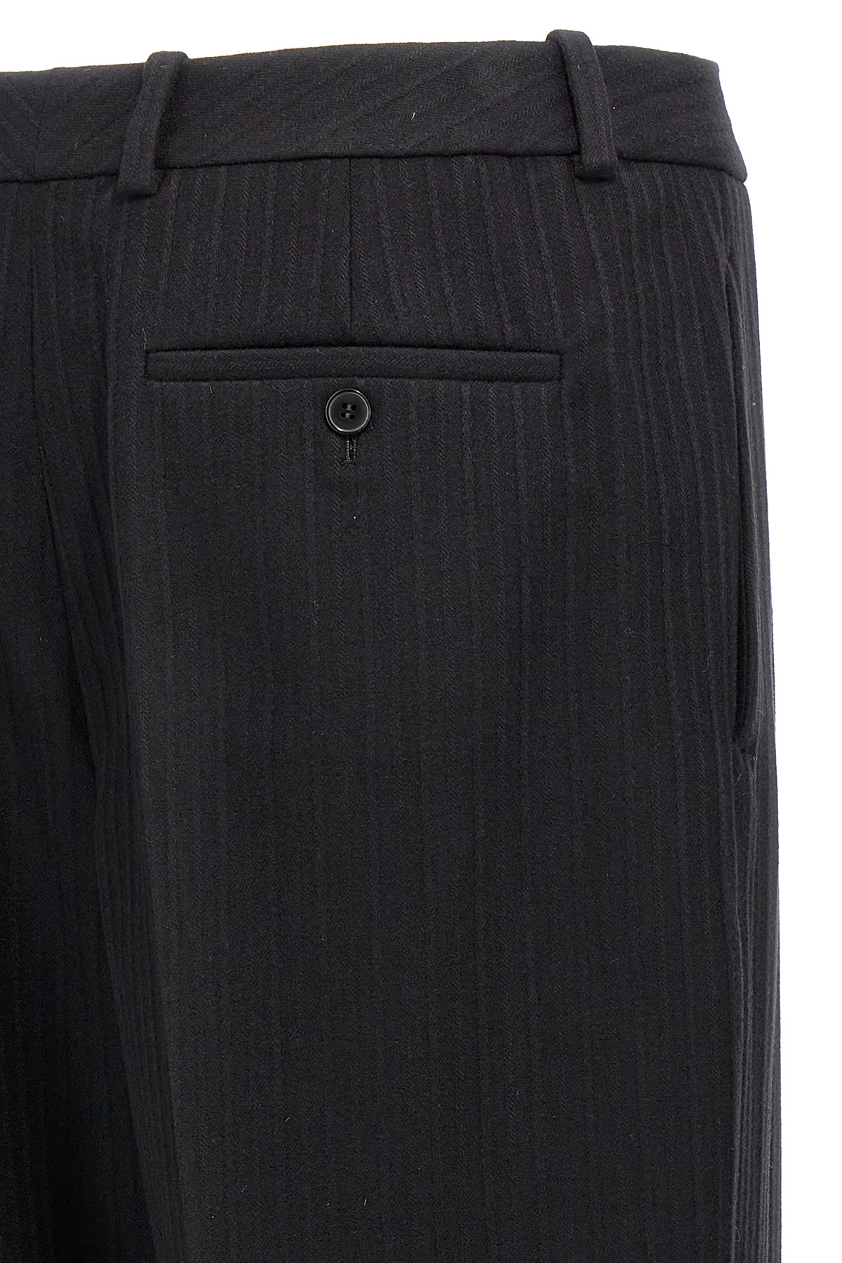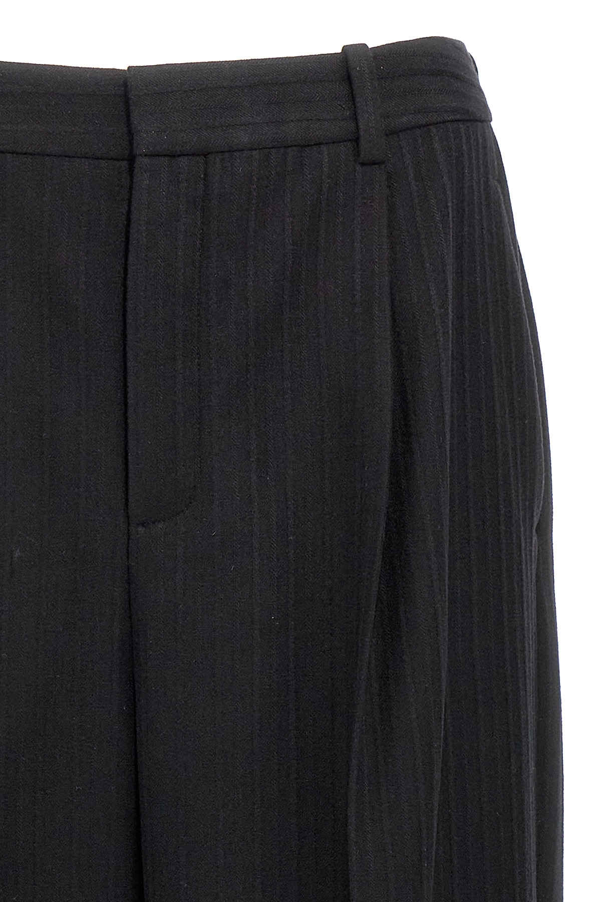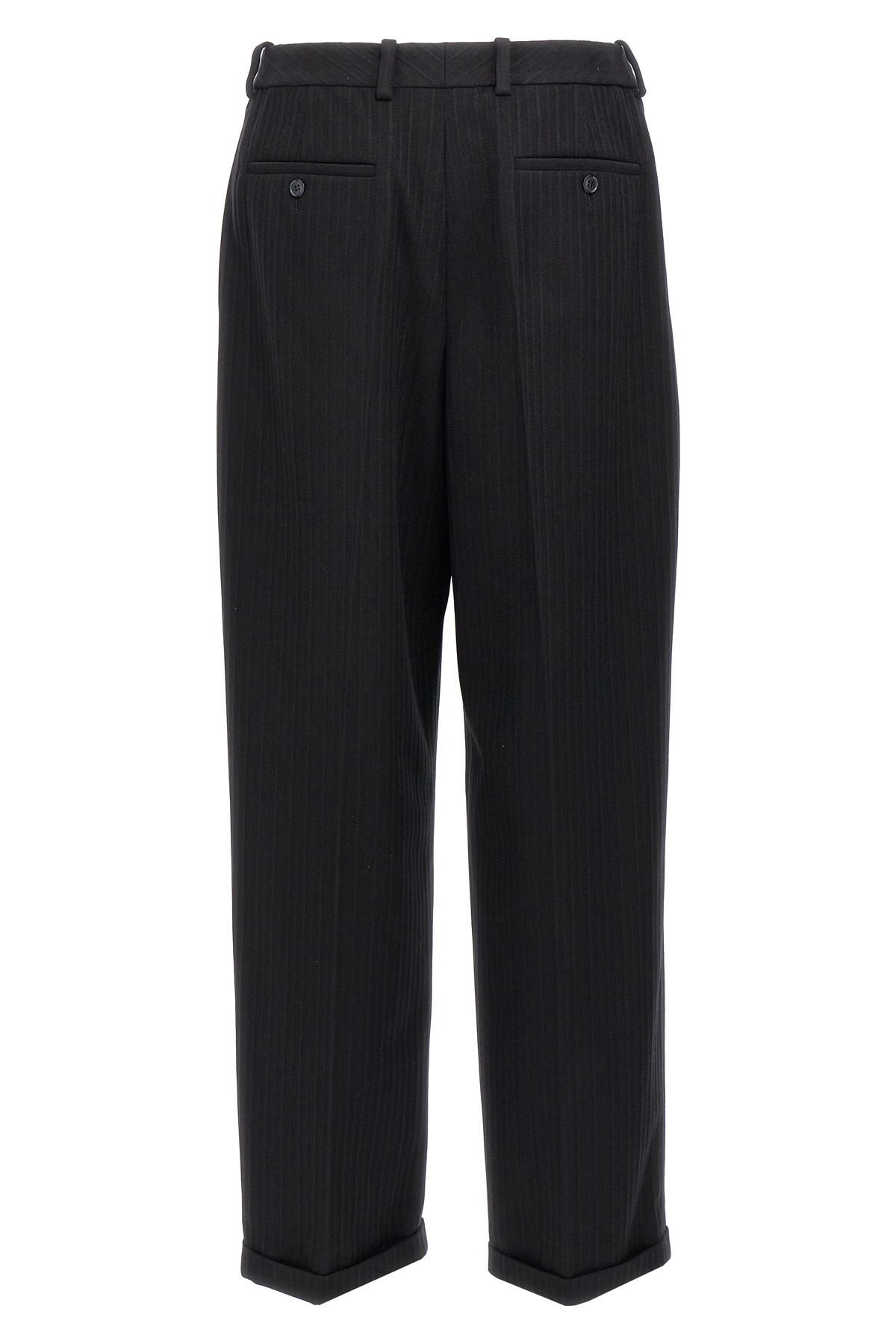 '90's' wool and cashmere trousers with tone-on-tone embossed relief, hook and button zip closure, high-waisted style, straight leg with stretched pleat, pockets, turned-up hem.