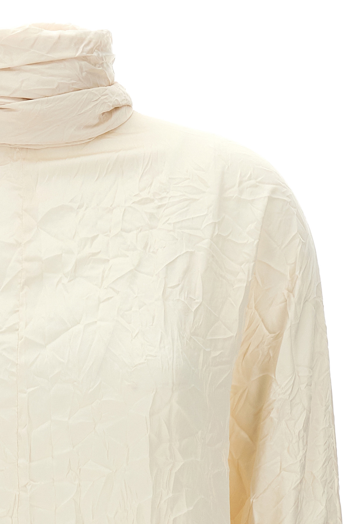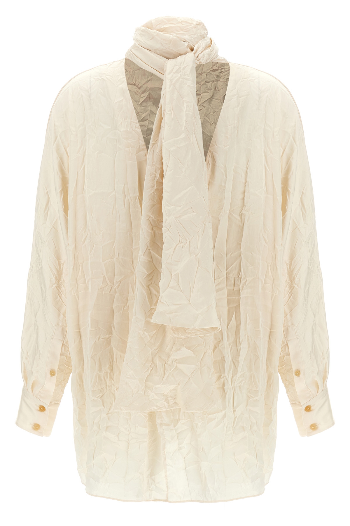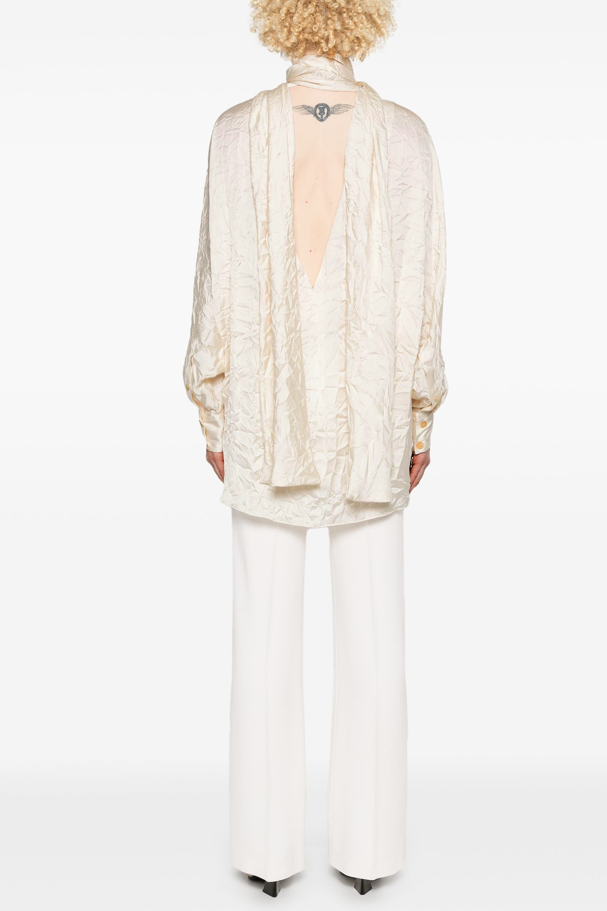 'Bex' blouse in wrinkled silk-effect fabric with long cuffed sleeves, sash at the neck, to wear with V-neck or V-neck.