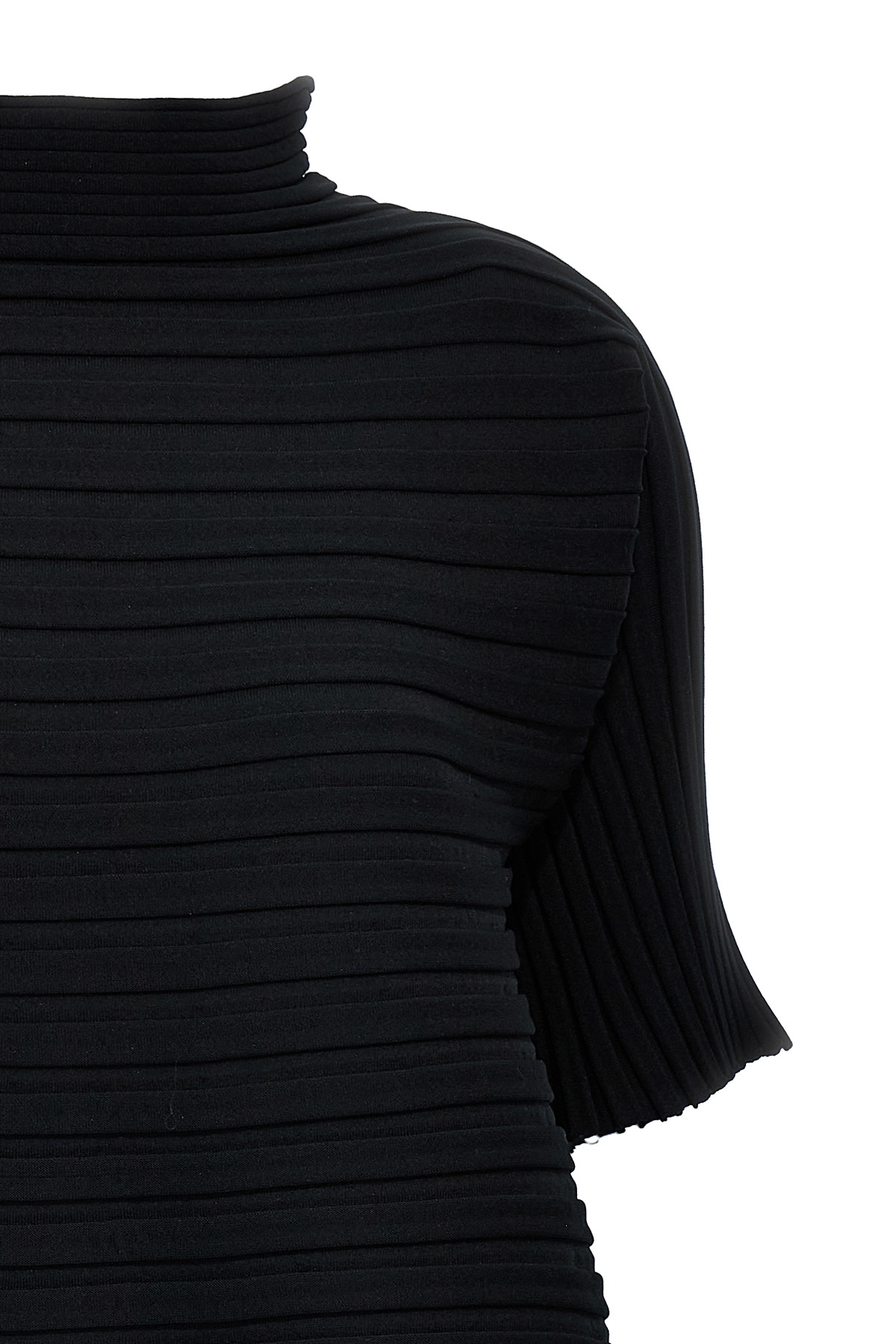 'Bounce Knit' pleated blouse, high neck, short sleeves, flared hem.