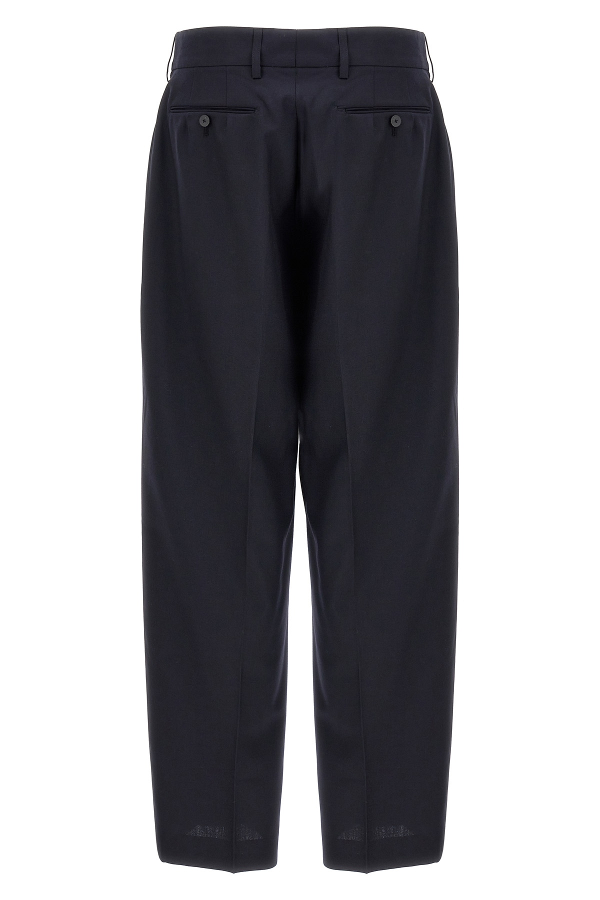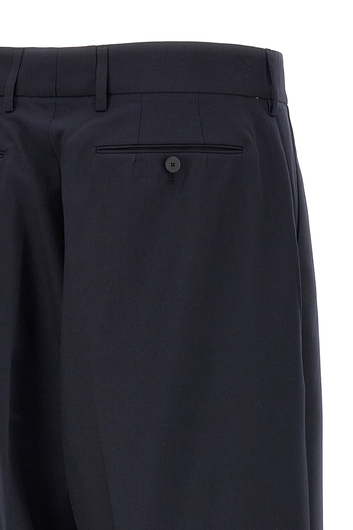 Wool blend pants, ironed pleats and pleats, zip, hook and button closure, pockets.