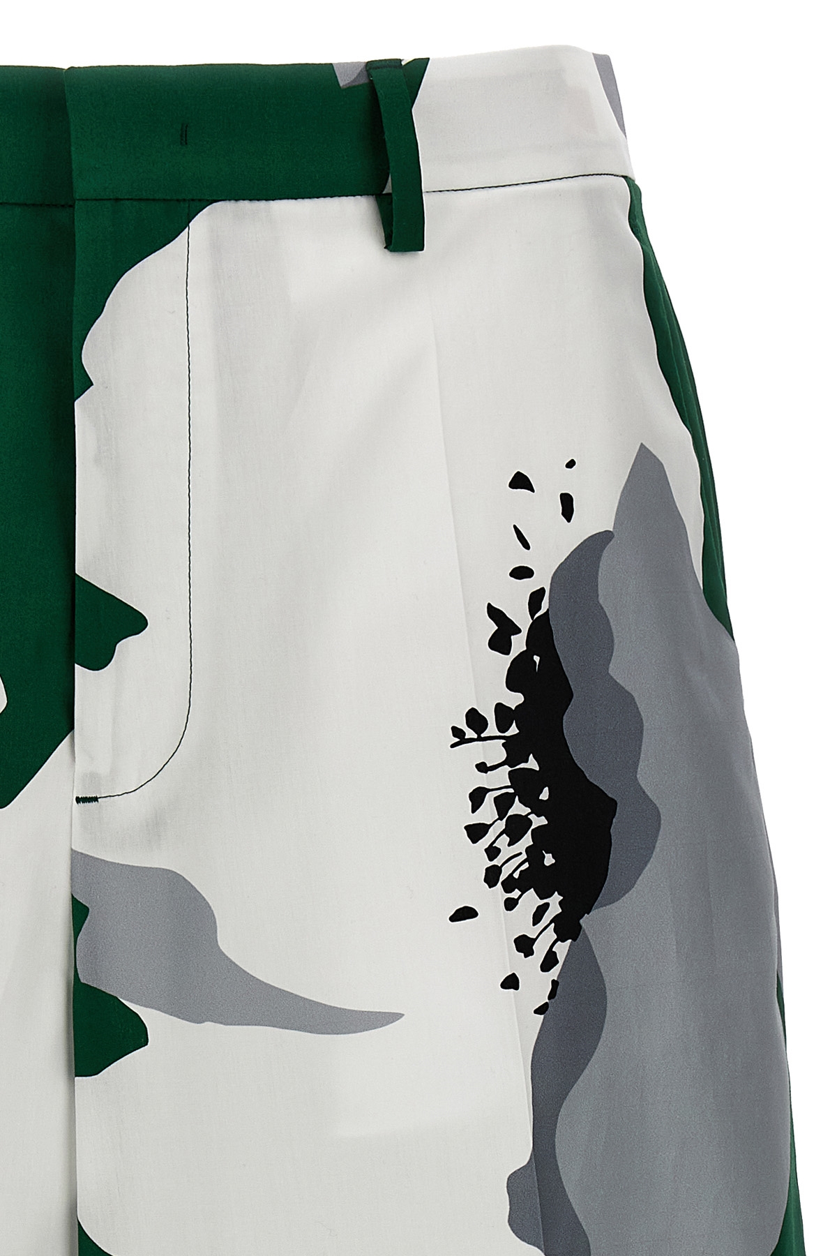 Floral print cotton bermuda shorts, zipper, hook and button closure, pockets.