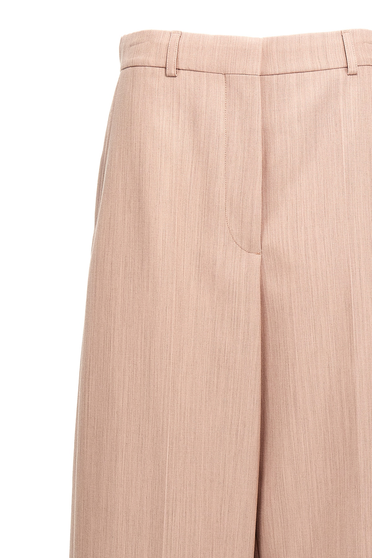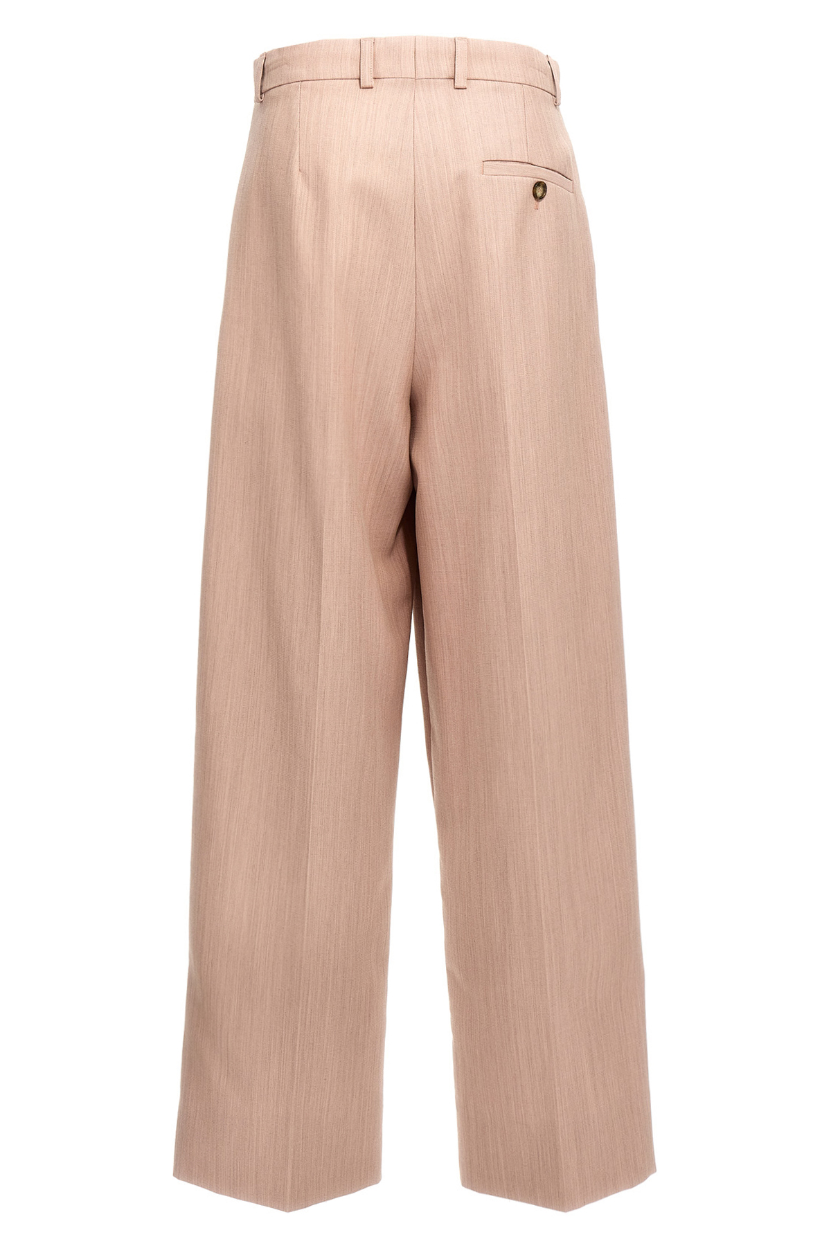 Wool trousers, straight and wide leg with stretched pleat, hook and button zip closure, pockets.