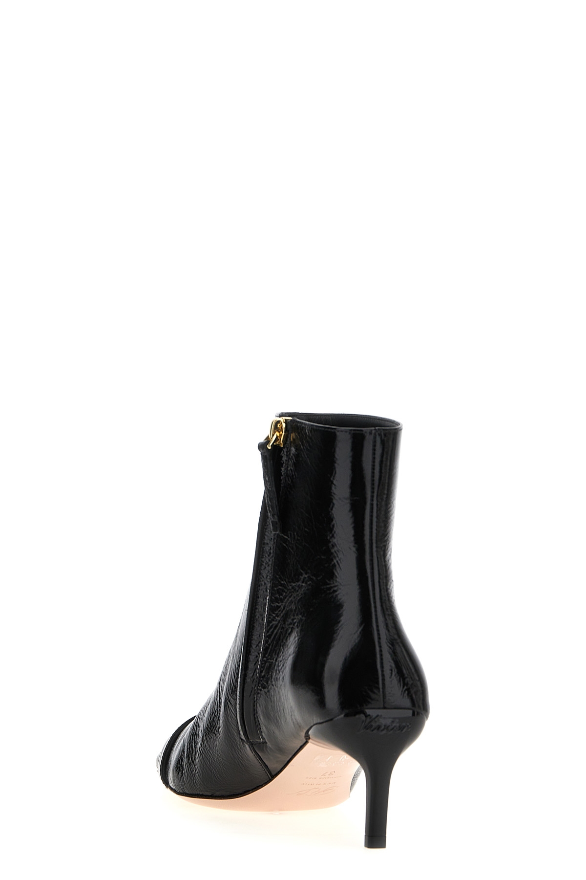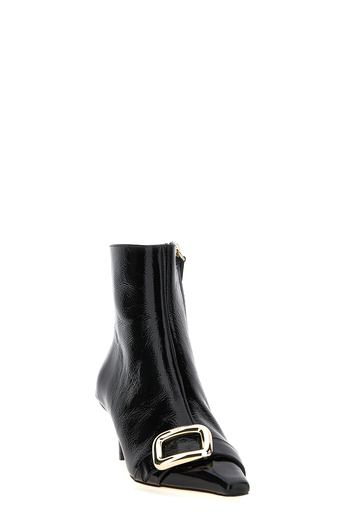 'Choc Bootie' patent leather ankle boots with front metal buckle detail, side zip closure, low heel.