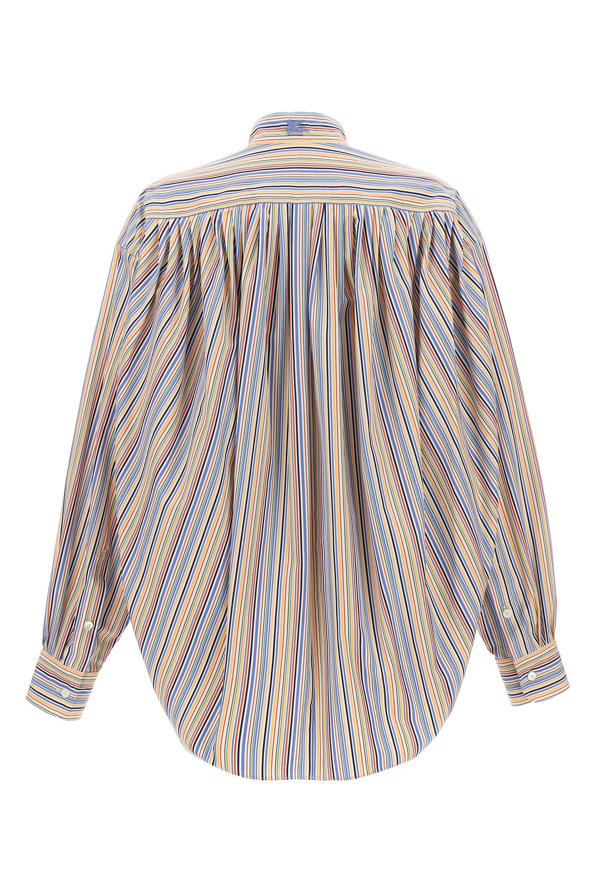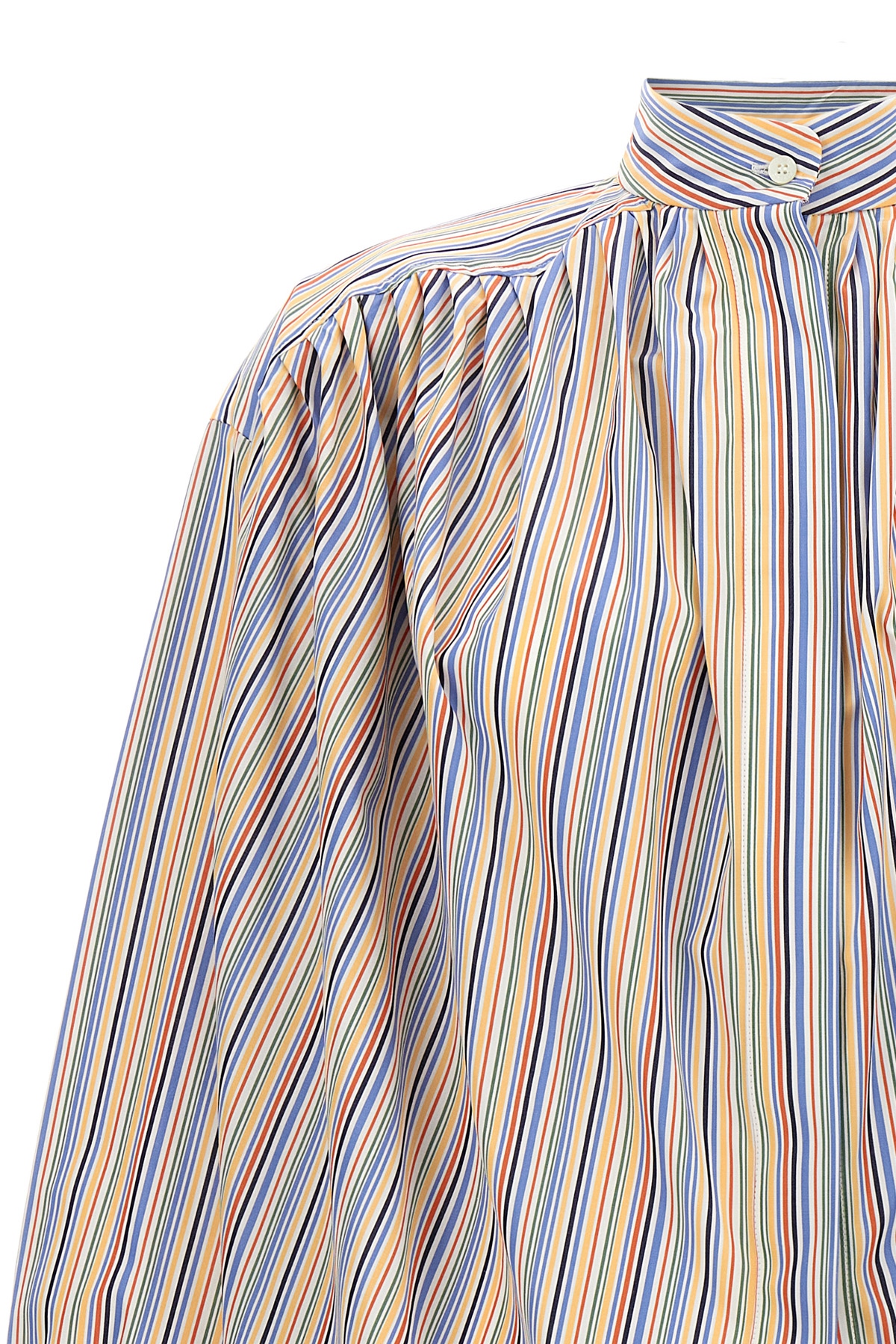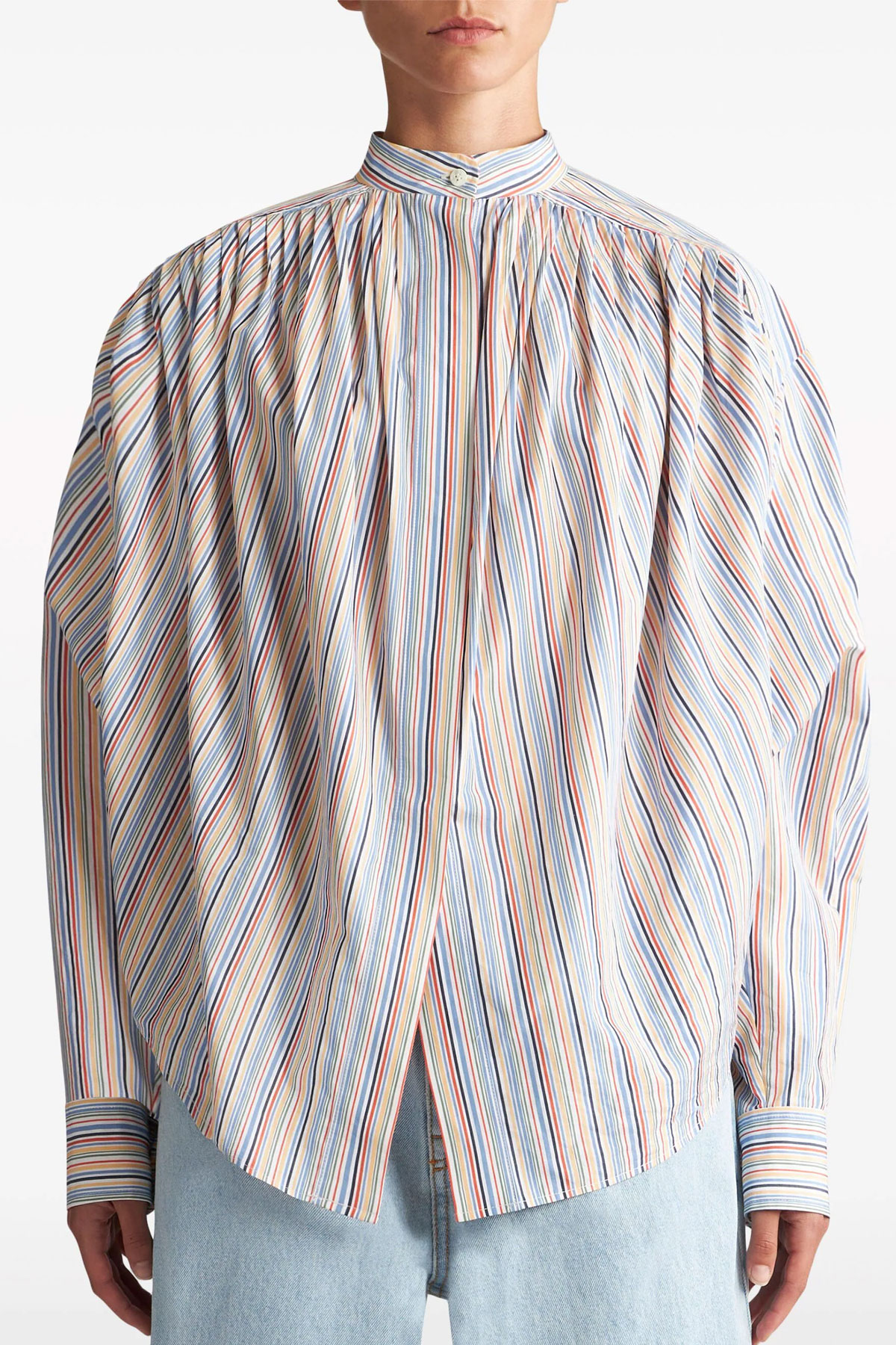 Striped cotton shirt, with high collar, button closure, and long cuffed sleeves.