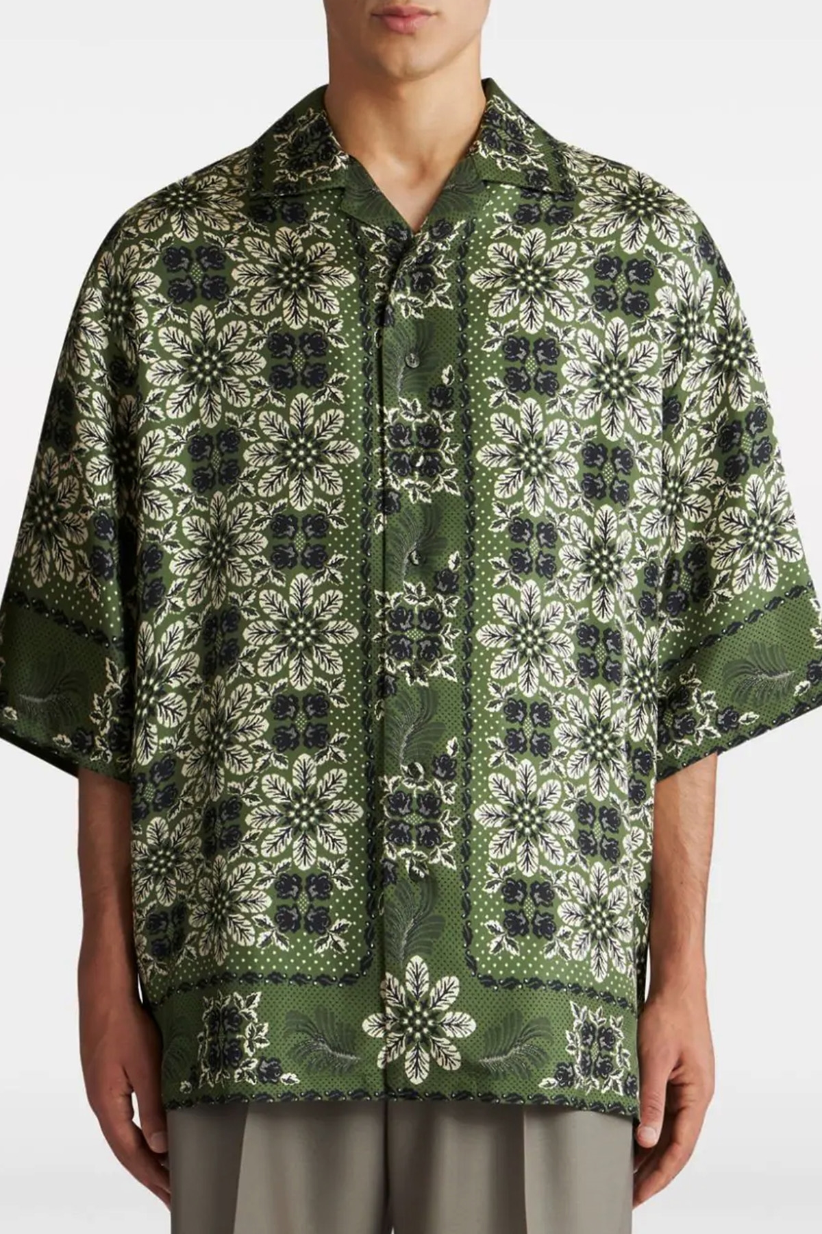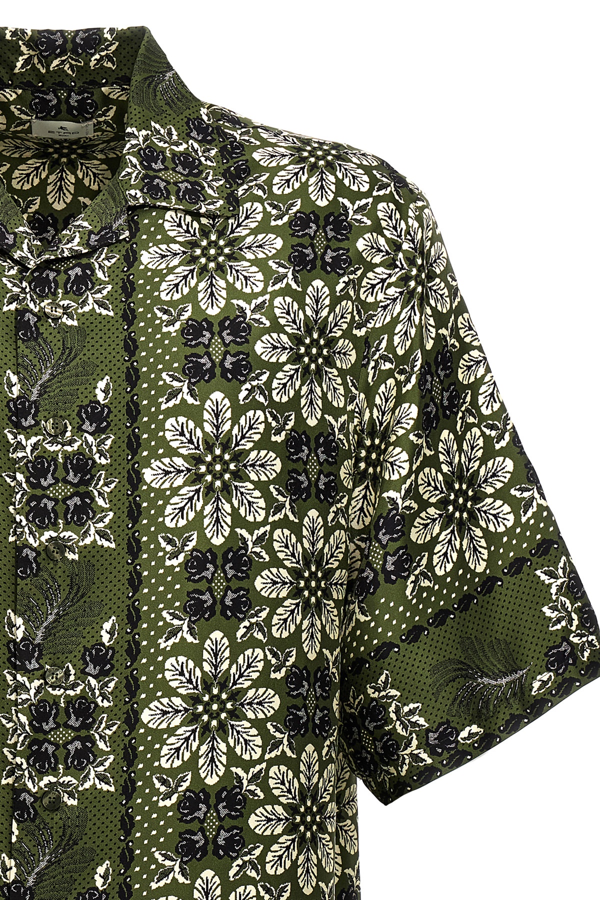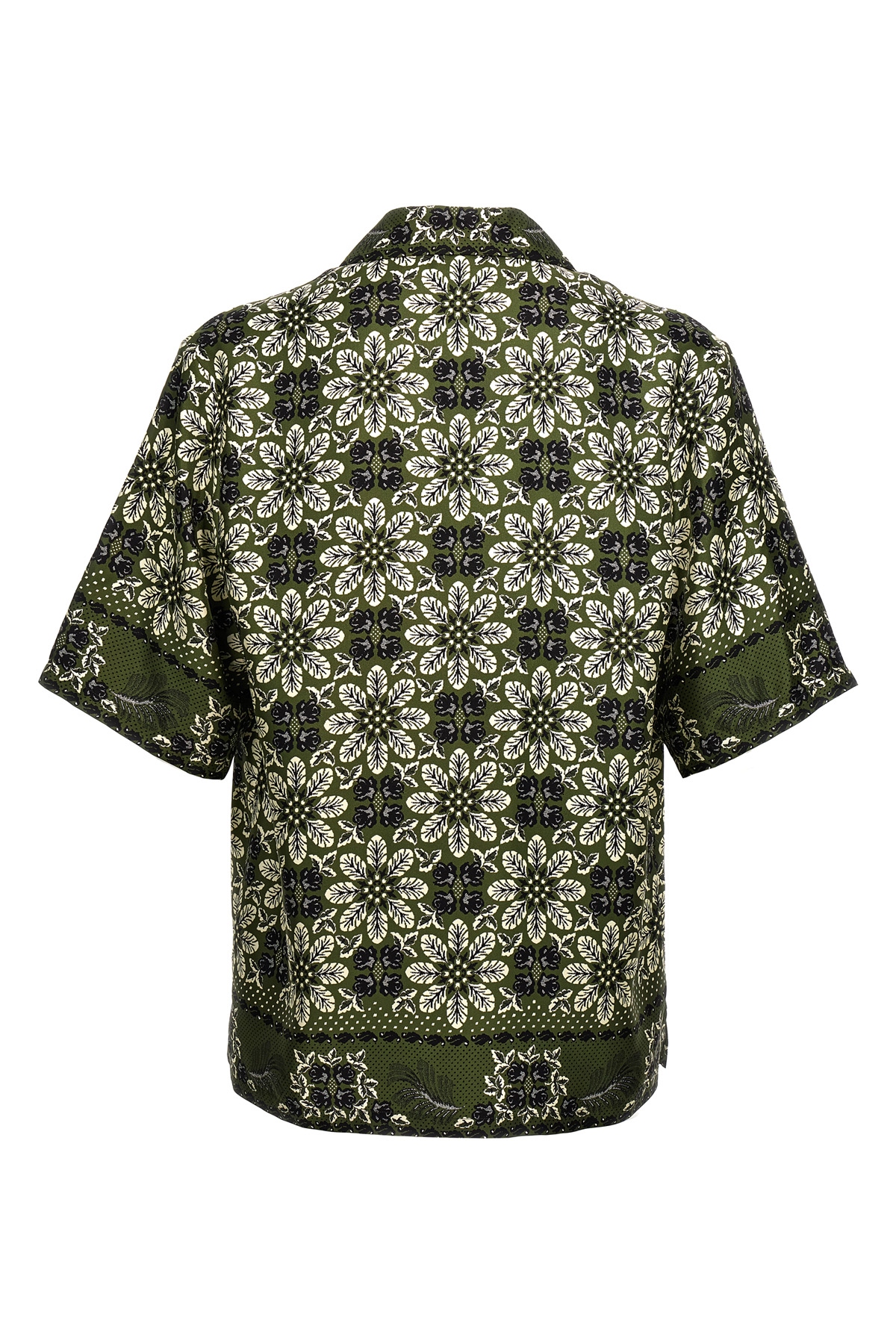 All-over floral print silk shirt, button closure, short sleeves.