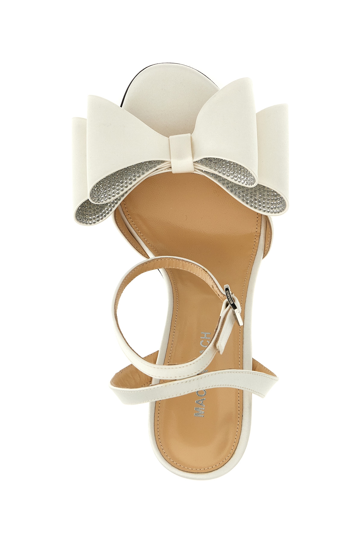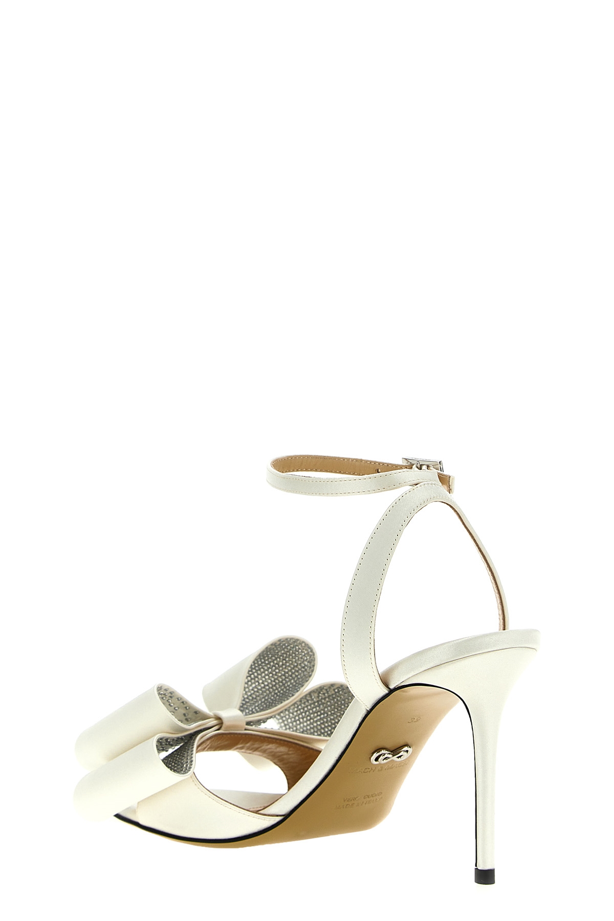'Le Cadeau' satin sandals with adjustable ankle strap, bow application with rhinestones on the front, high heel.