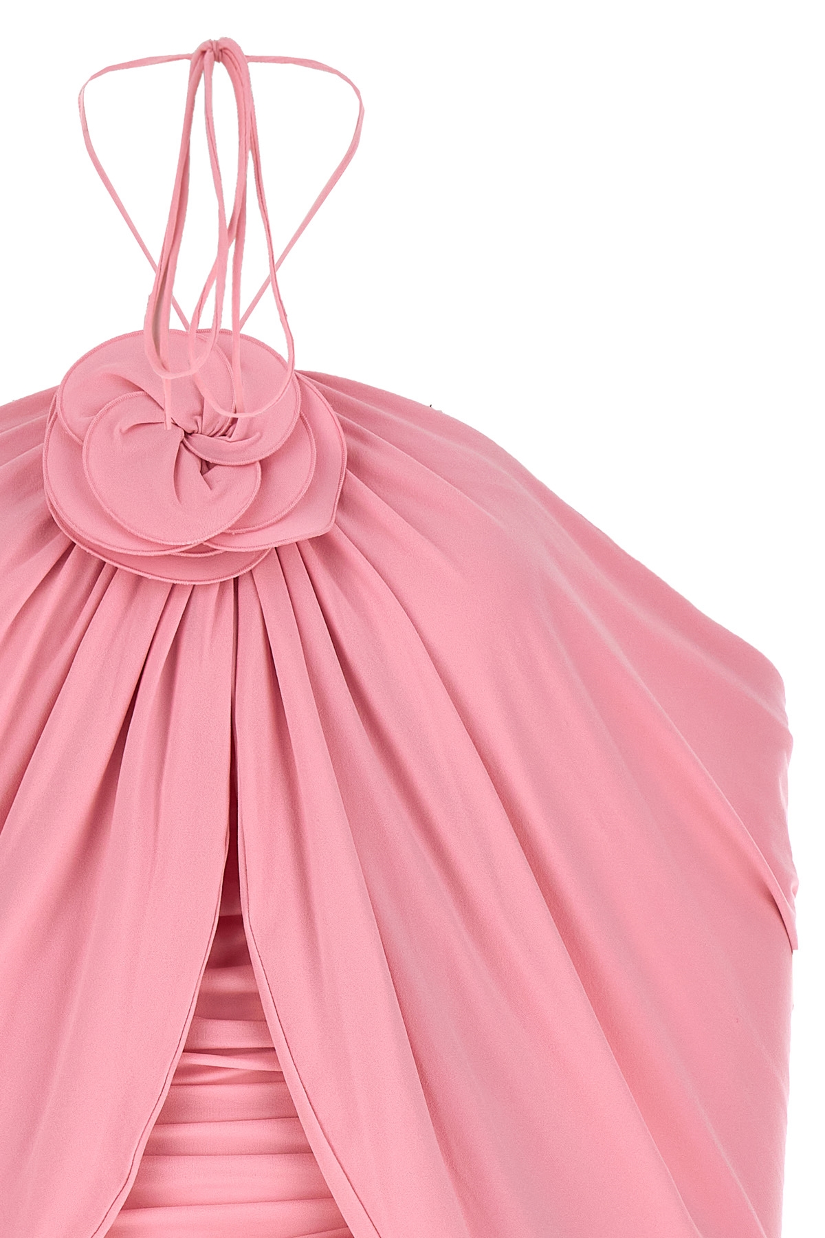 '09' dress in stretch fabric, mini draped model with cape effect with rose on the chest that closes with lacing at the neck.