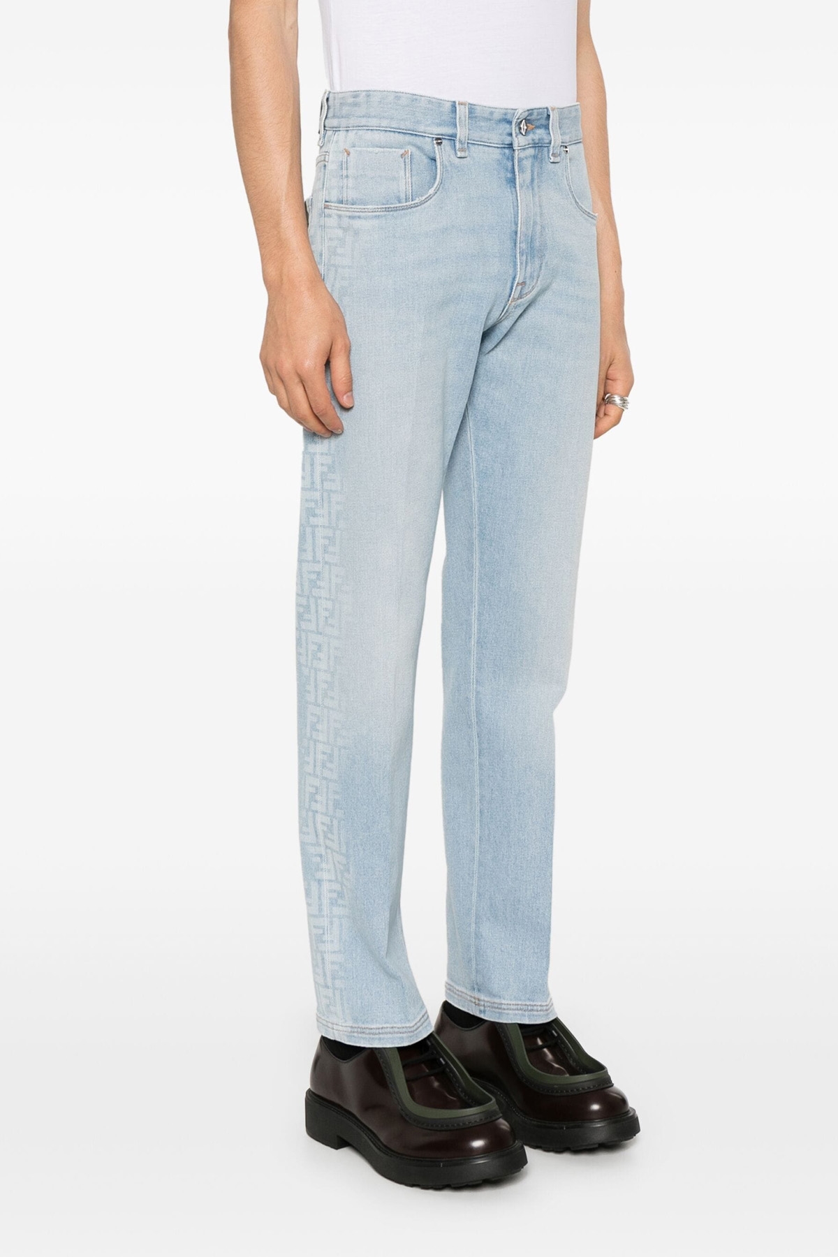 Cotton denim jeans with degrade effect side 'FF' pattern, stretched pleat leg and used-effect details, zip and button closure, five pockets, leather logo tag.