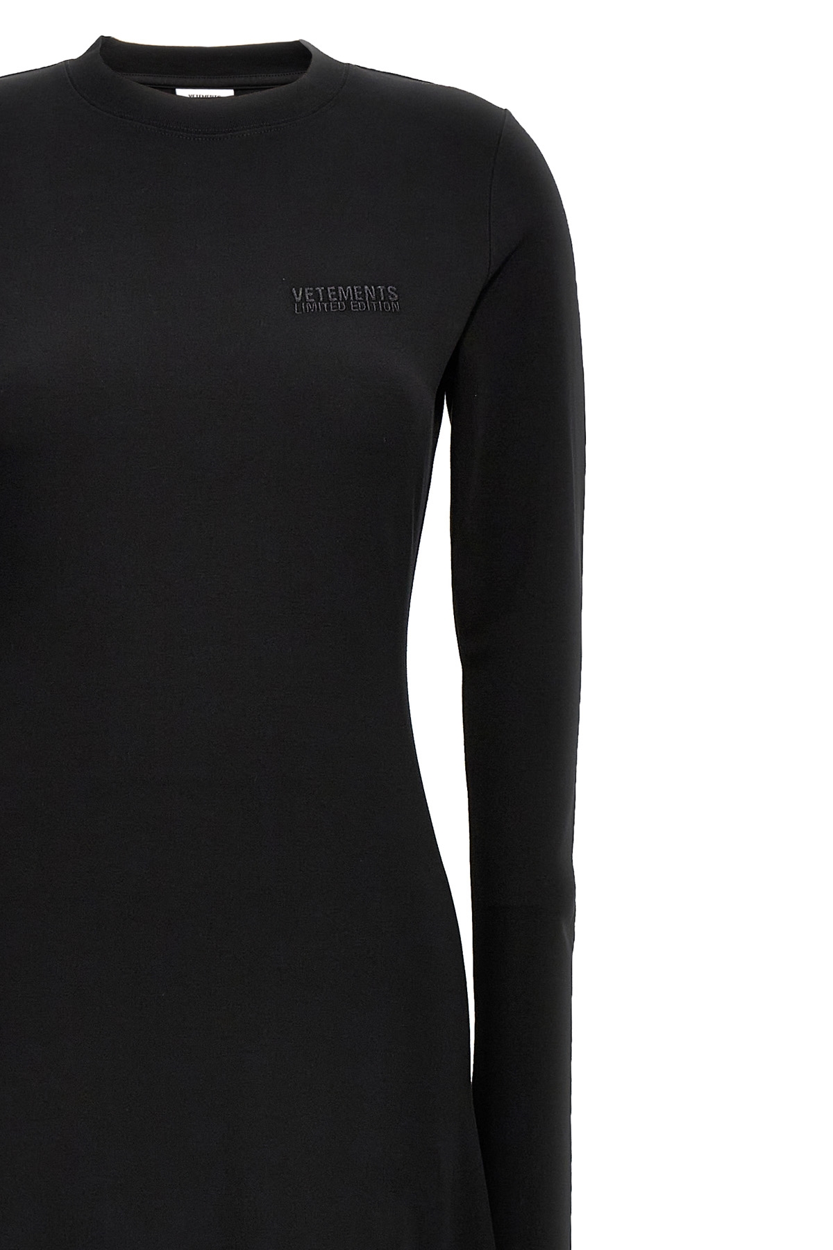 Long cotton dress with front embroidered logo, crew neck, long sleeves.