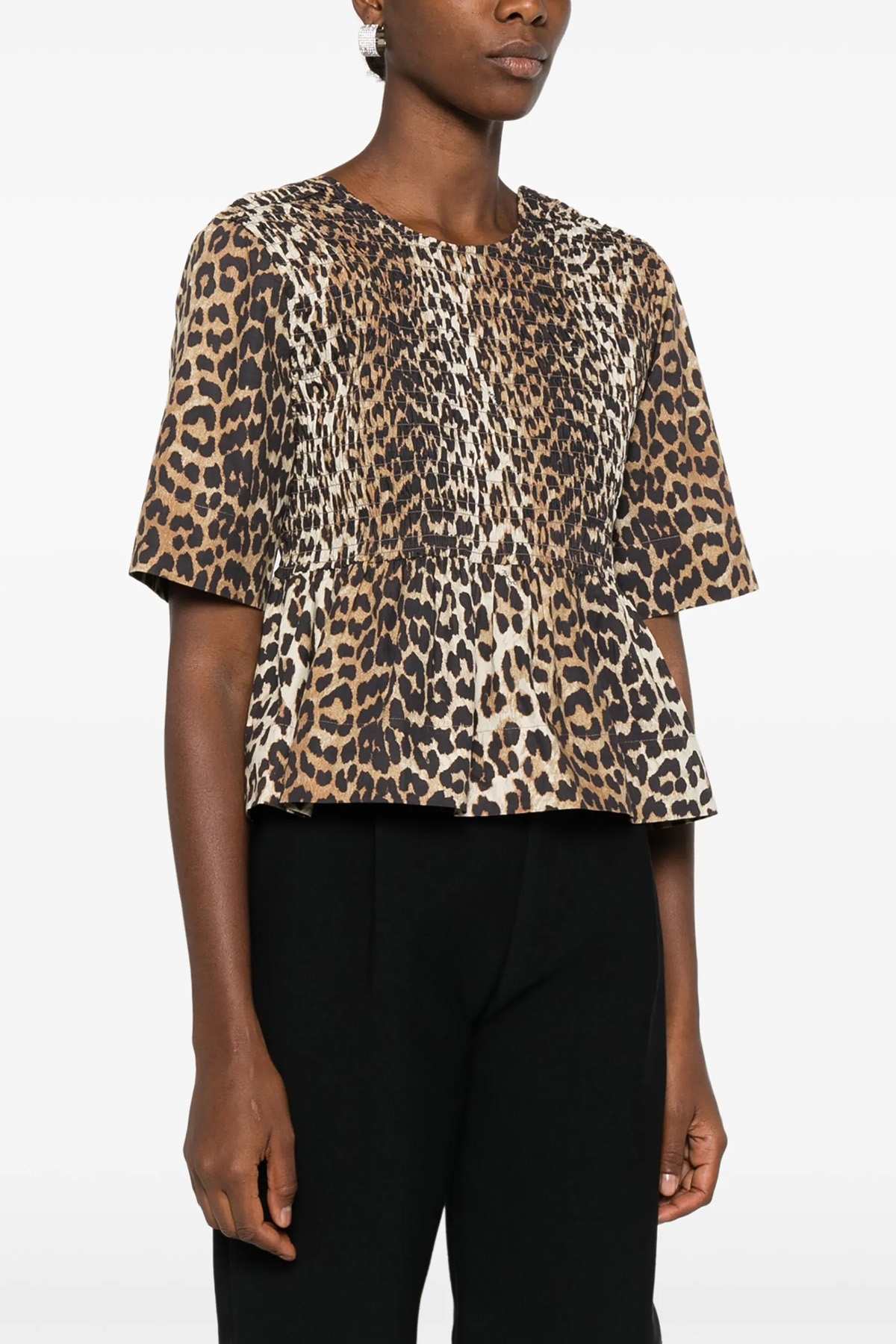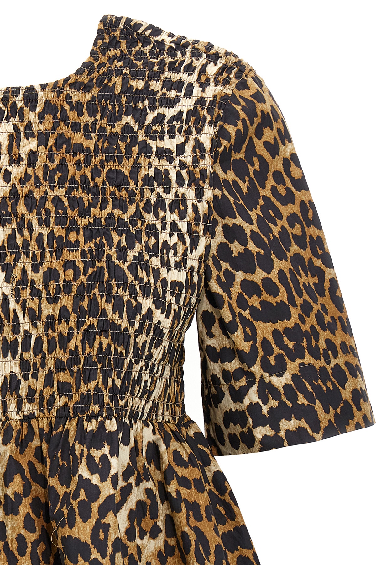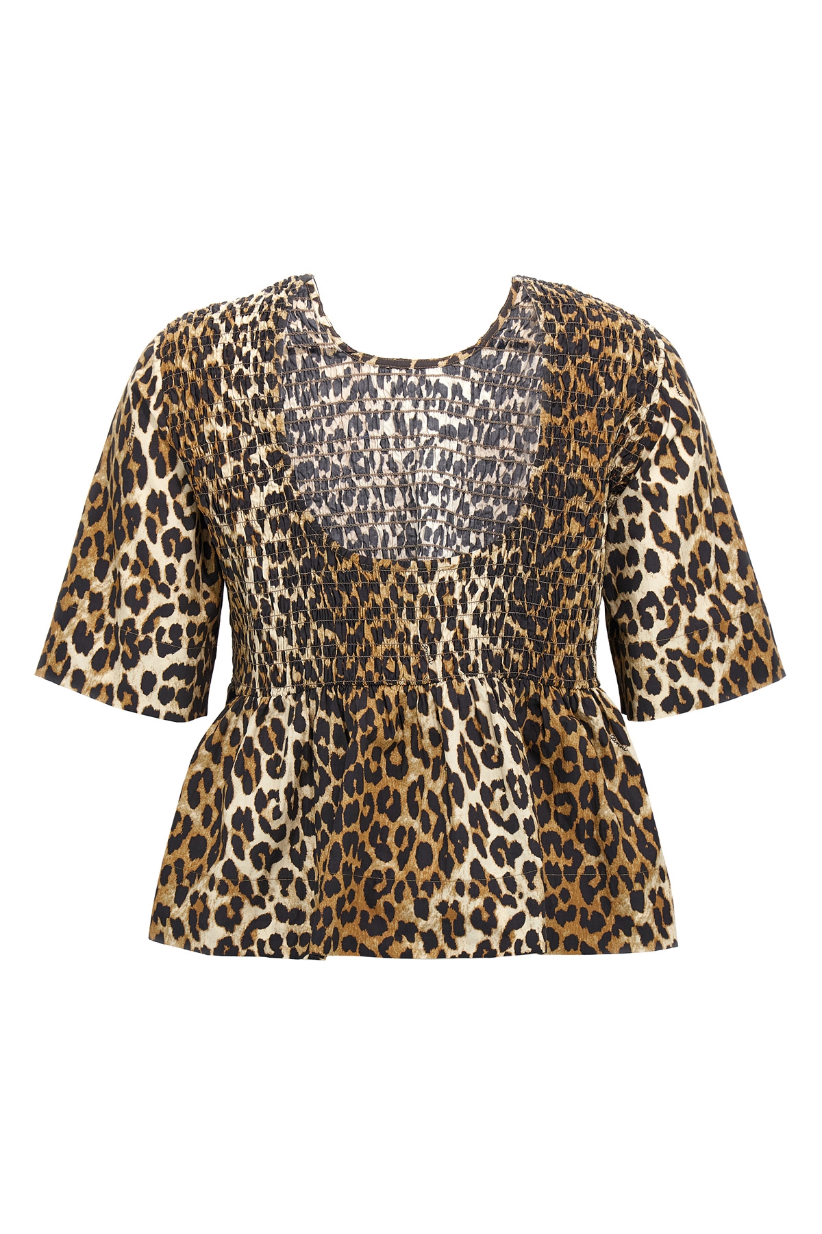 Smock leopard print cotton blouse with round neckline, bare back, and short sleeves. SUSTAINABLE: This product is made of organic cotton.