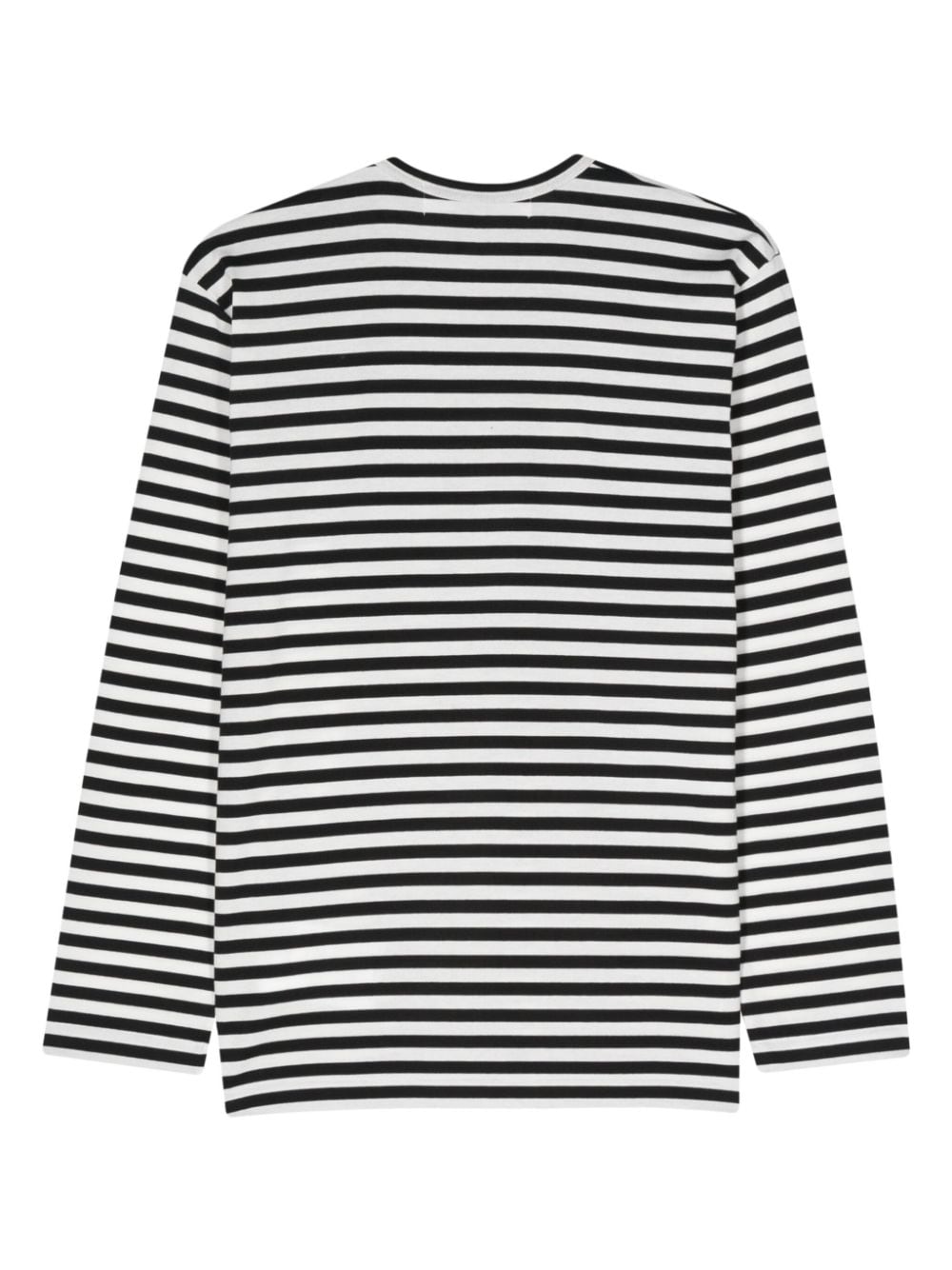 Black, white cotton jersey texture horizontal stripe pattern crew neck long sleeves signature heart patch at the chest straight hem.