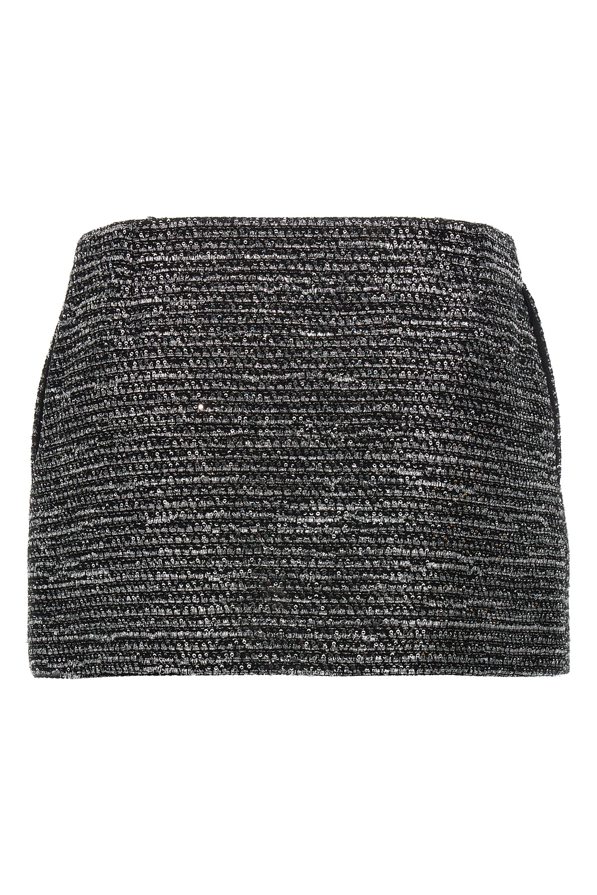 Lame striped tweed skirt, front logo buttons, pockets, side zip closure.