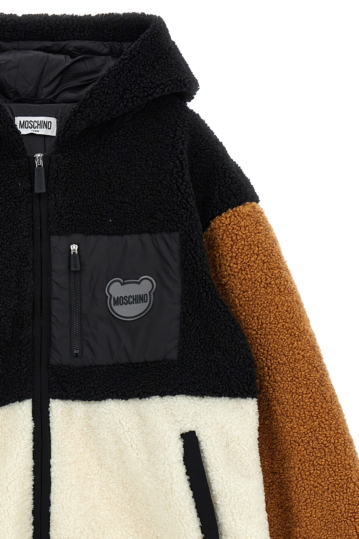 KIDS Teddy fabric hooded jacket, nylon lining, front rubber logo patch, zip closure, pockets, long sleeves with knitted cuffs.