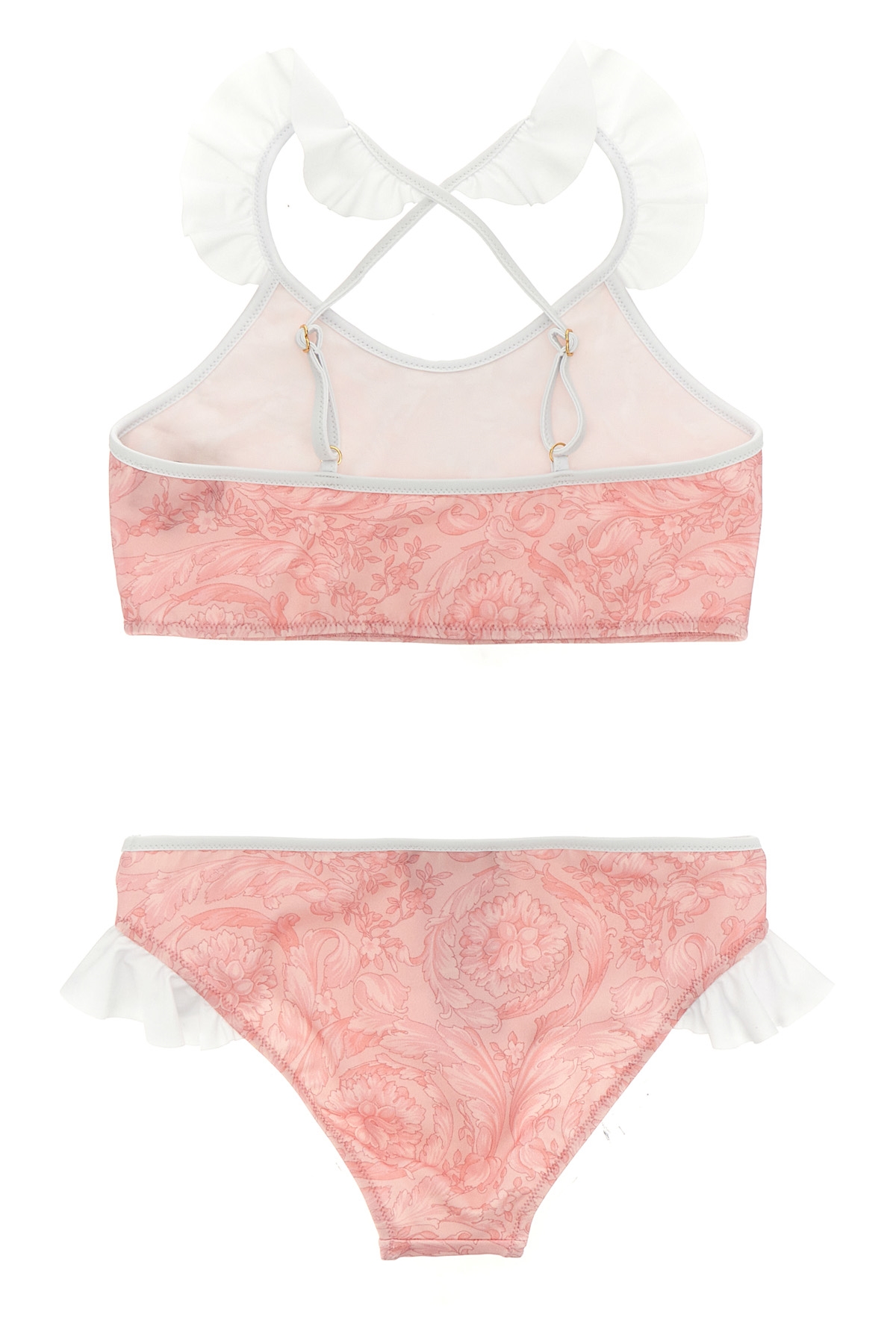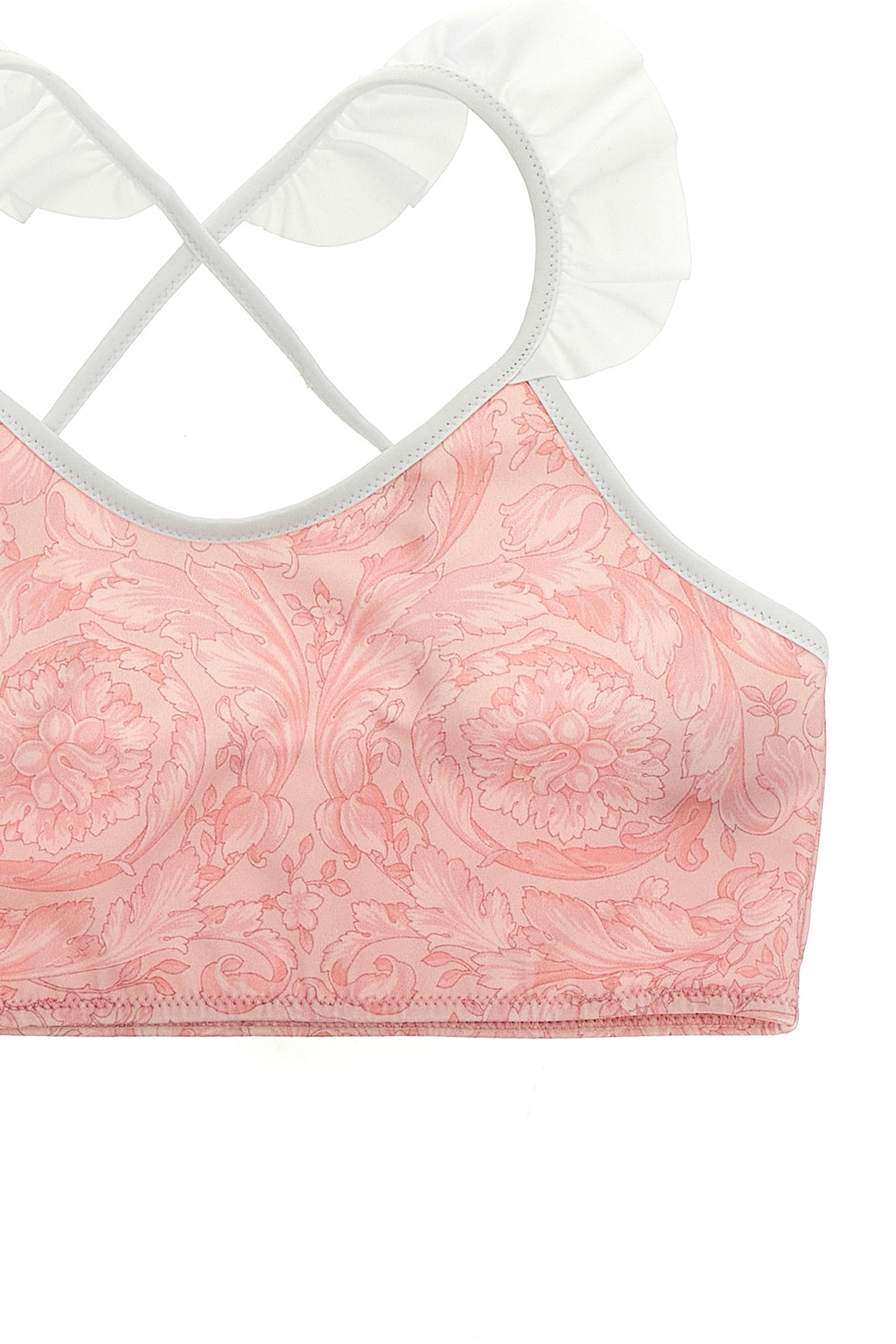 KIDS 'Barocco' print stretch fabric bikini, top with thin adjustable straps woven at the back, ruffle detail.