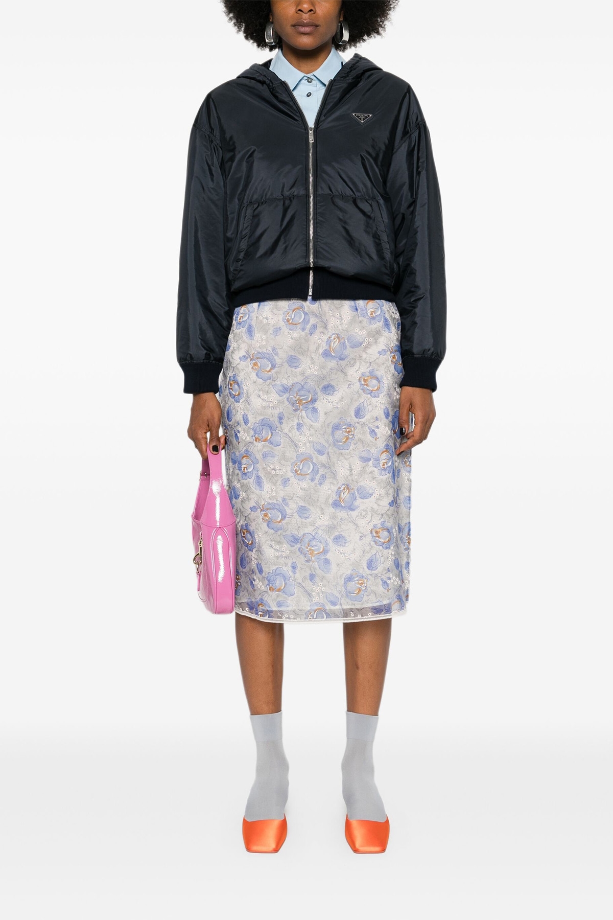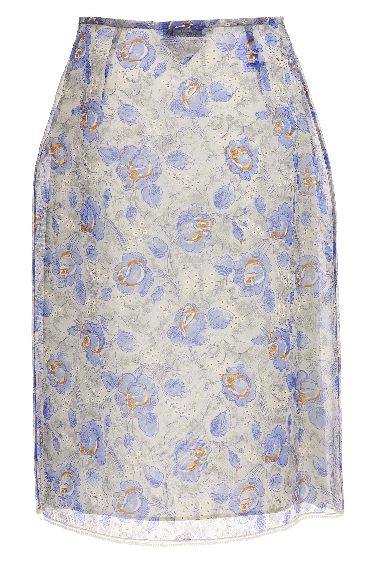 Nylonette midi skirt with 'Peonia' print, sheer fabric with removable underskirt and side button closure.