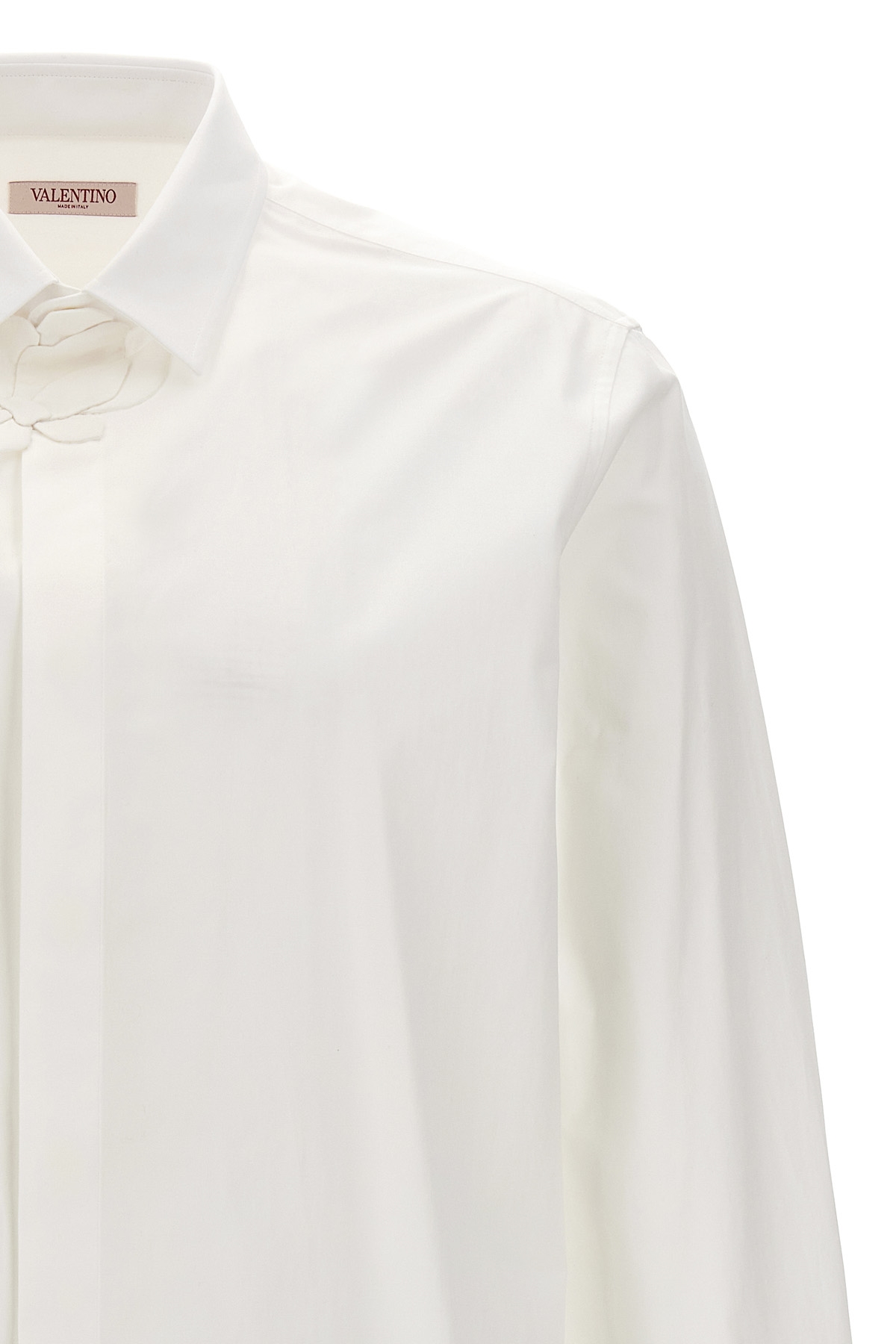 Cotton poplin shirt with flower patch around the neck, button closure, long cuffed sleeves.