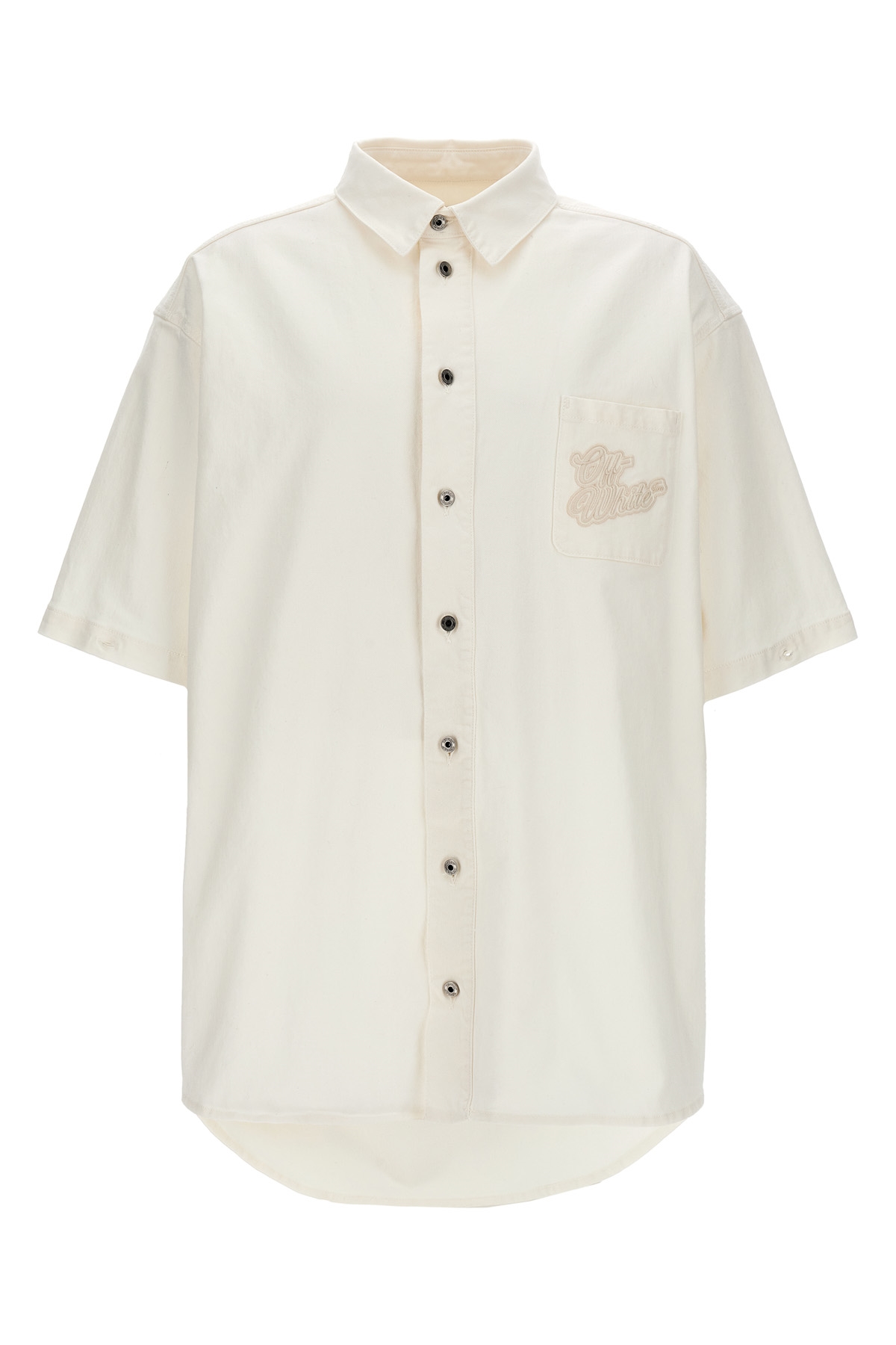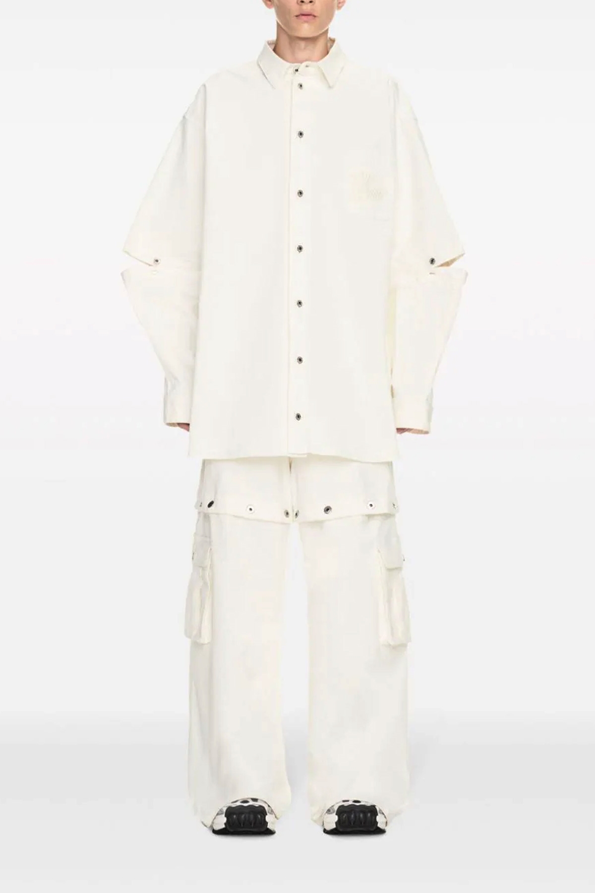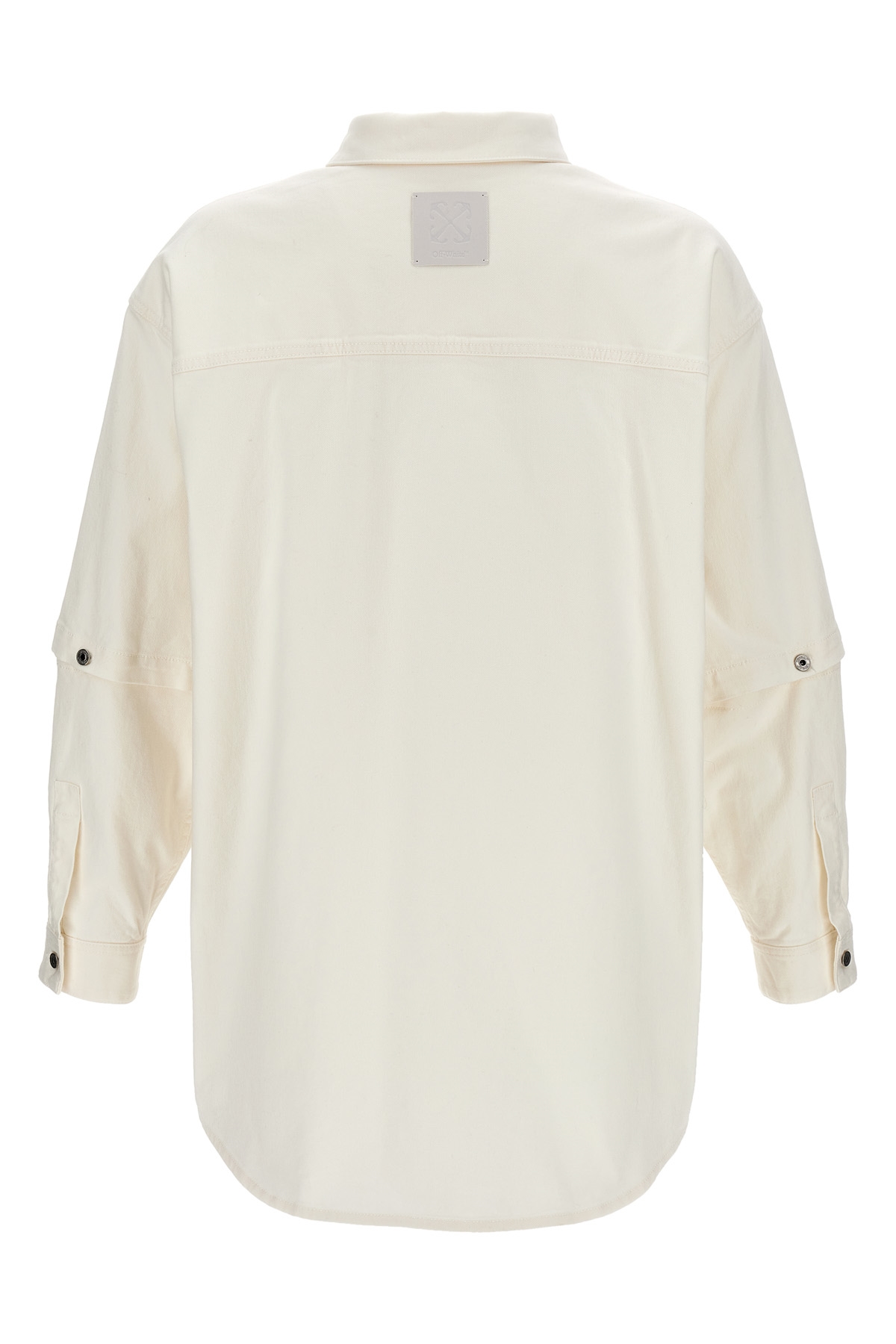Denim overshirt with button closure, button sleeve detail to convert in short sleeves. Tonal logo embroidery.