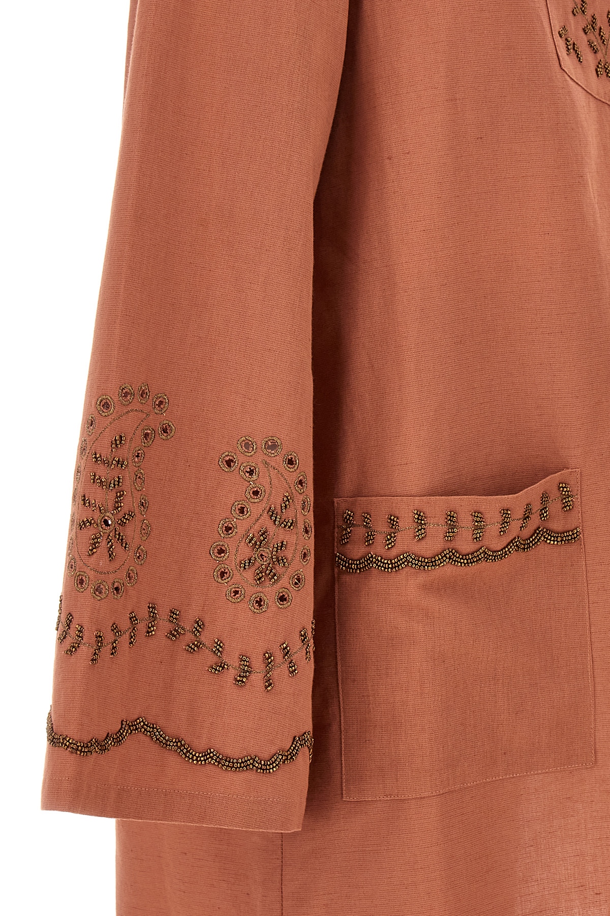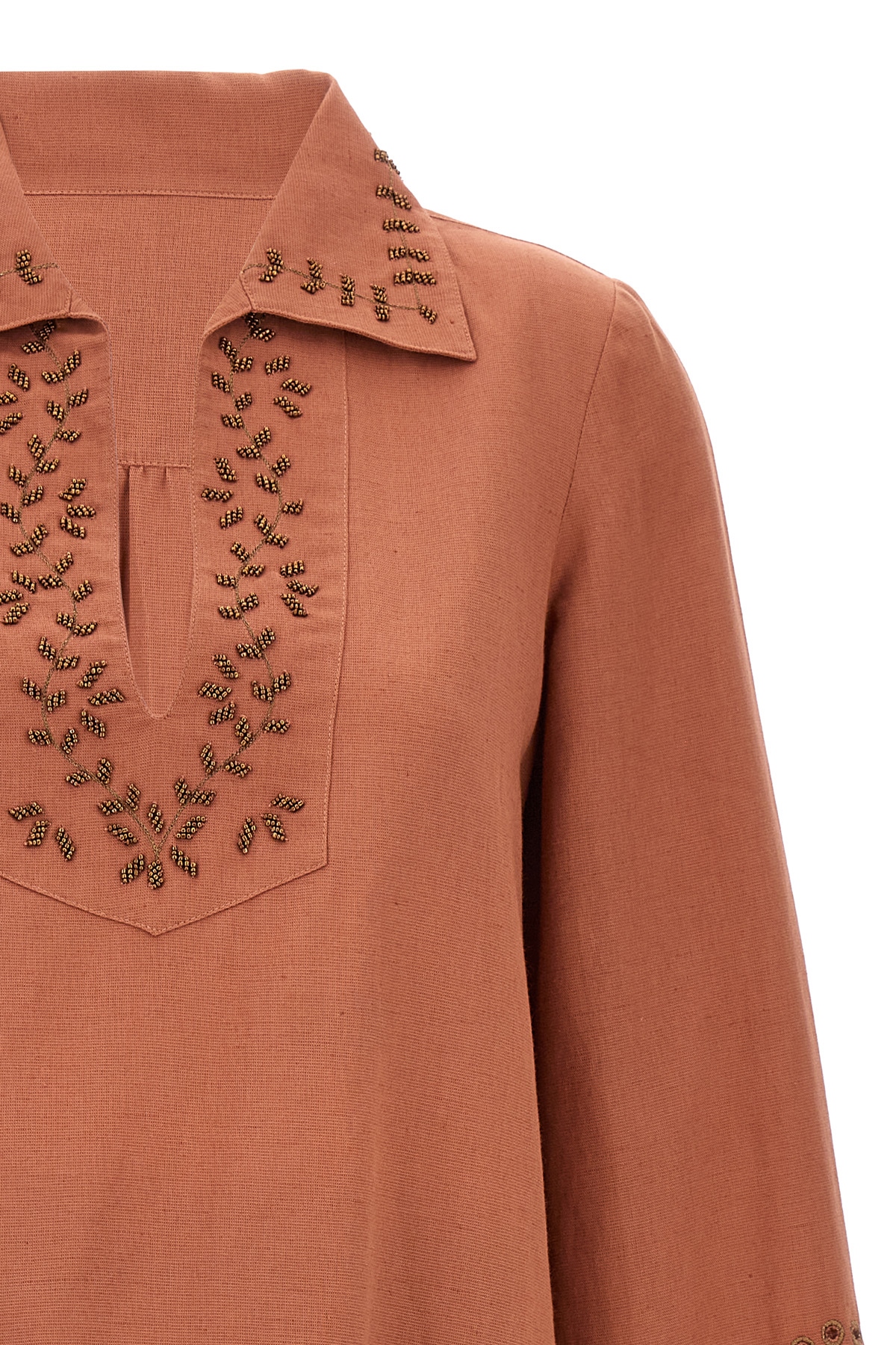 'Genevieve' cotton dress with V-neck and collar, beads applique, long and wide sleeves, front pockets.