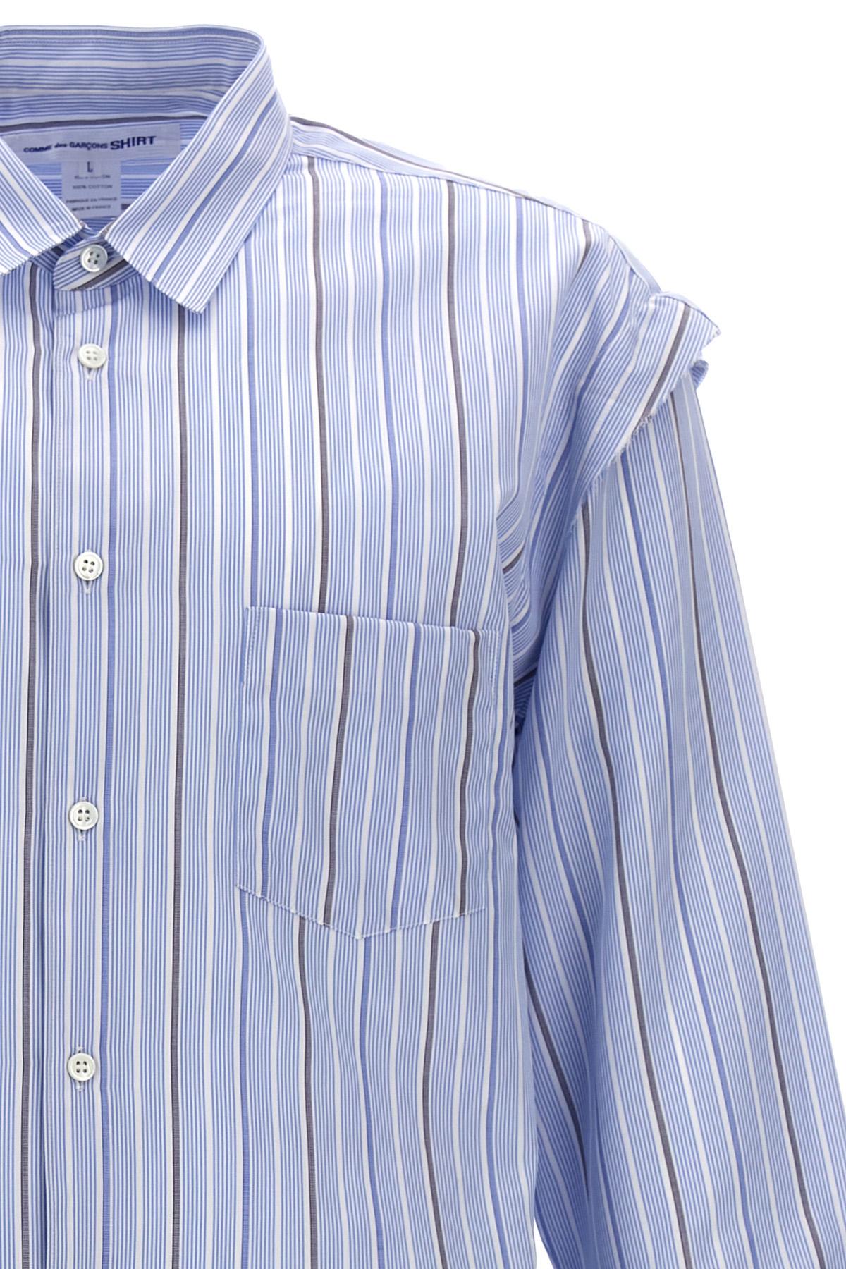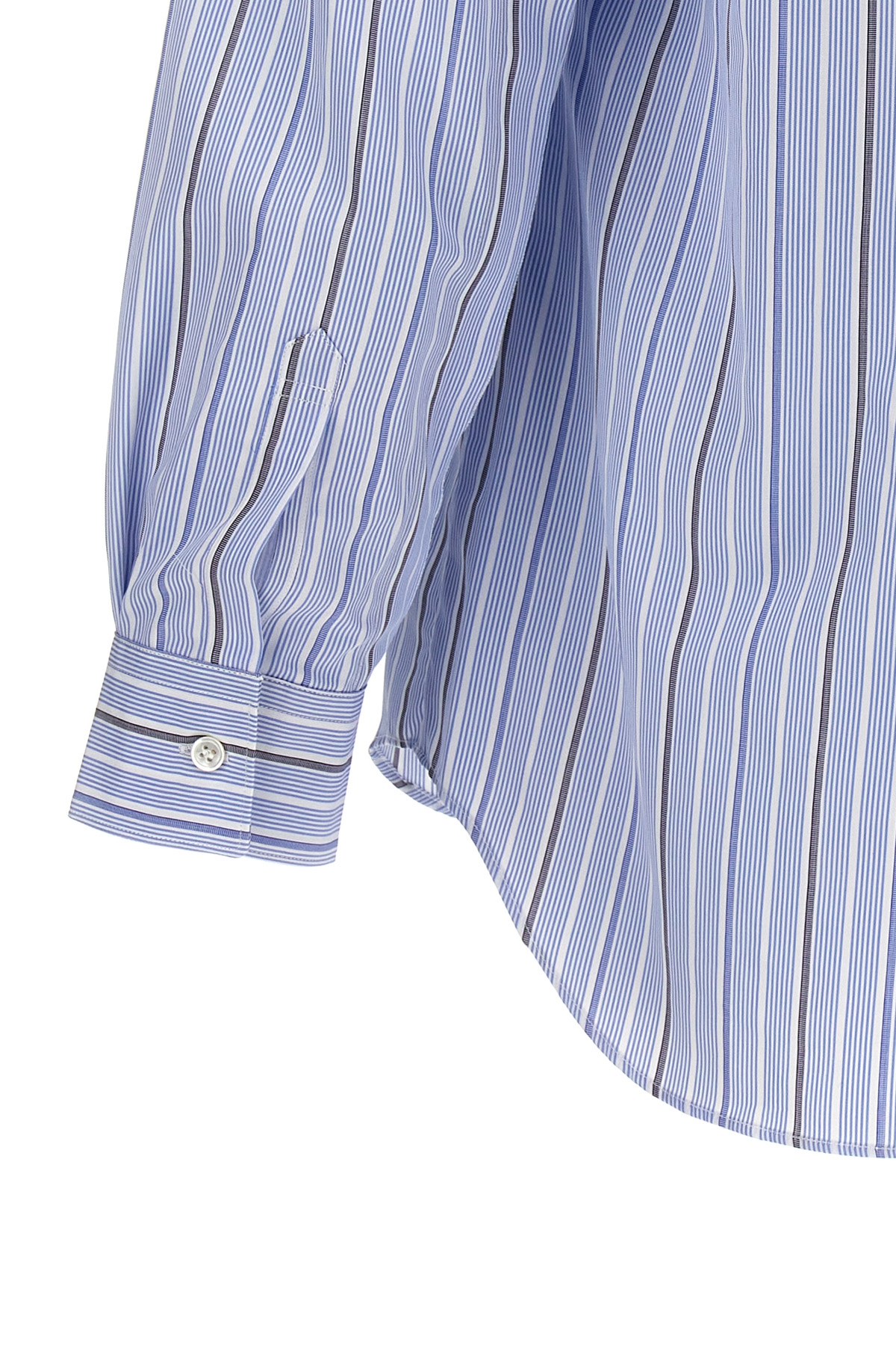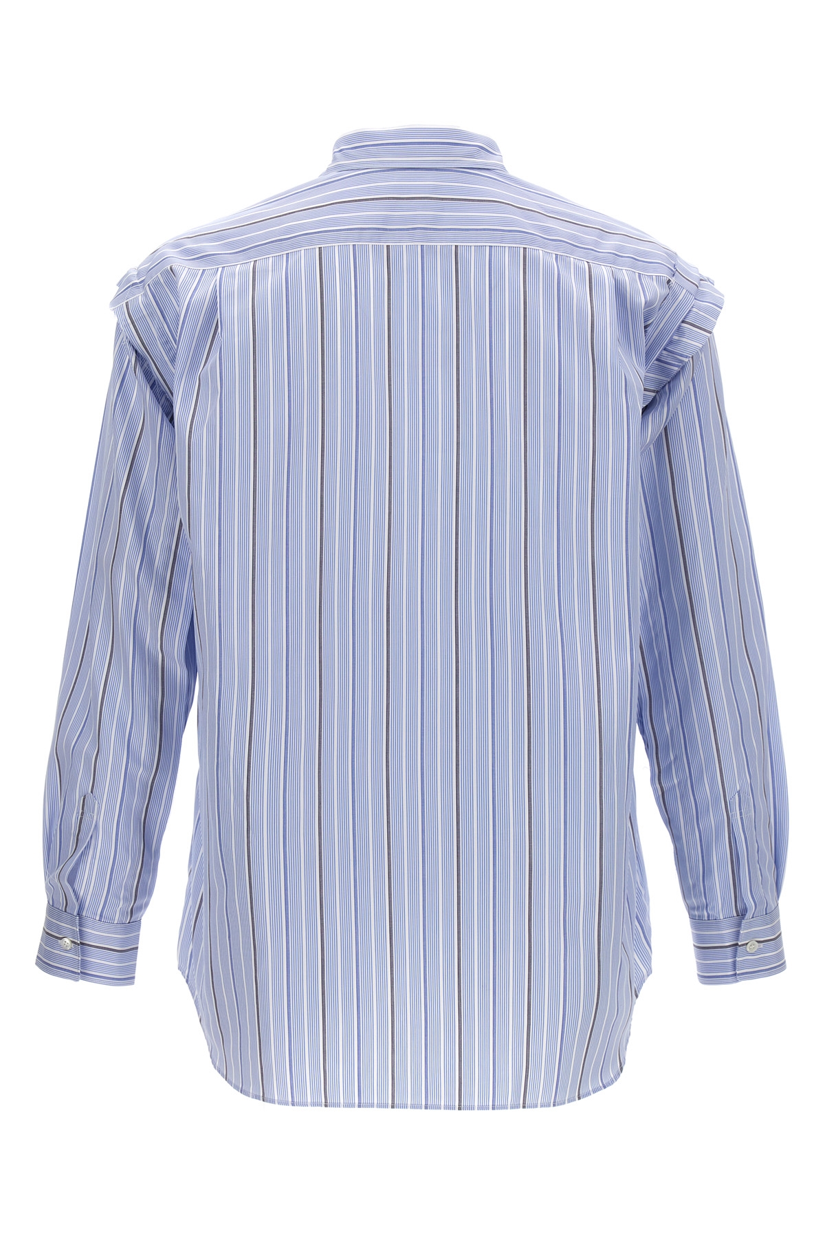 Striped cotton shirt, unfinished detail on the shoulders, front pocket, button closure, long cuffed sleeves.