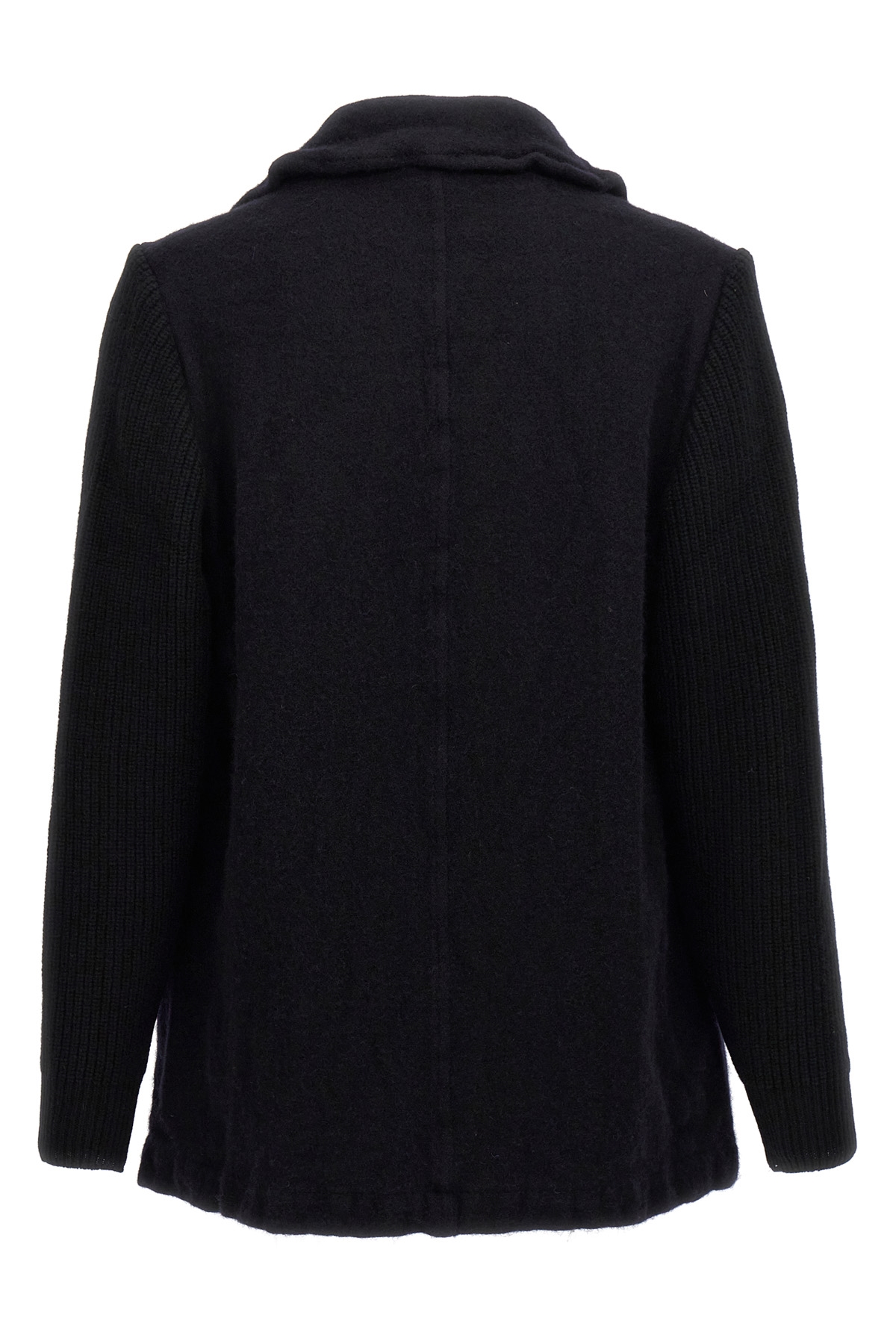 Double-breasted wool cloth coat with long knitted cuffed sleeves, button closure, pockets.
